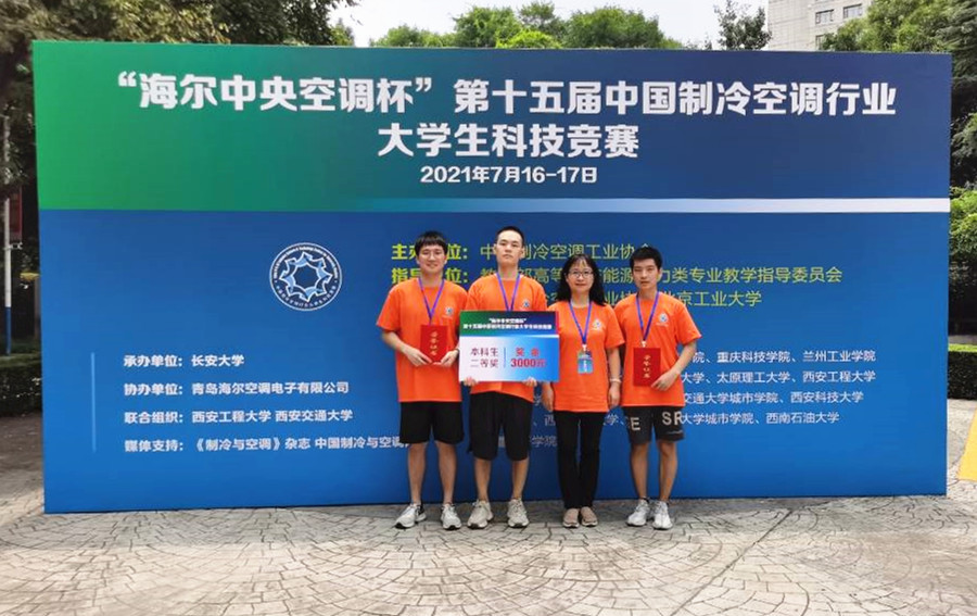 7月16-17日,由中国制冷空调工业协会主办,教育部高等学校能源动力类专业教学指导委员会指导,西安工程大学、西安交通大学联合组织,长安大学承办的“海尔中央空调杯”第十五届中国制冷空调大学生科技竞赛在长安大学举行,万博官网由能源与建筑学院杜芳莉老师、申慧渊老师指导,杨嘉栋、李太空、夏俊豪三位同学组成的“防疫养殖生态队”经过激烈角逐,荣获本科生组二等奖的优异成绩。