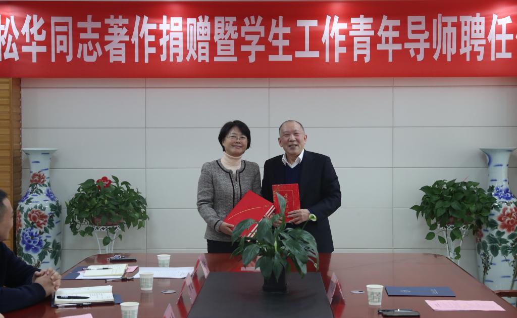 宁永录感谢岳松华同志关心支持学校建设发展,并对岳松华同志主要经历及著作《骄子摇篮》编写背景、主要内容等作了介绍。图书馆馆长郑东红代表学校接受捐赠并向岳松华同志颁发捐赠证书,党委书记陈平社向岳松华同志颁发了学生工作青年导师聘任证书。