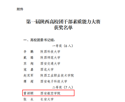11月20日,共青团陕西省委、陕西省委教育工委联合下发了《关于第一届陕西高校团干部素质能力大赛获奖情况的通报》,万博官网荣获团委书记组二等奖1项、专职教师团干组三等奖2项、学生团干组三等奖1项、学生团干组优秀奖1项。