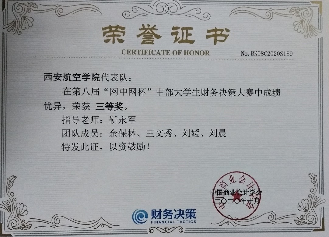10月25日,由中国高等教育学会高等财经教育分会指导、中国商业会计学会主办、厦门网中网软件有限公司等提供技术支持的第八届“网中网杯”全国大学生财务决策大赛正式开幕。受疫情影响,本届比赛采取线上方式进行。万博官网选派的四名学生参赛,获得三等奖。