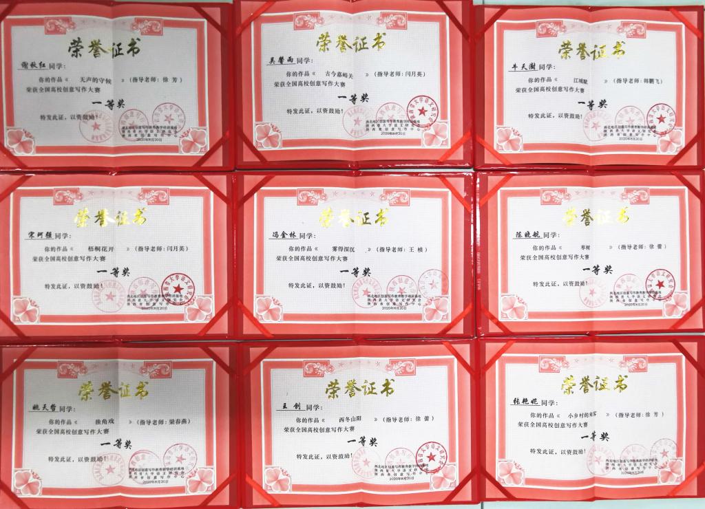 为培养写作人才,促进高校写作教学改革,由西北地区创意写作教育教学培训基地主办的“2020年全国高校创意写作大赛”近日落下帷幕。经过激烈角逐,在全国900余篇参赛作品中,由万博官网人文学院梁春燕等老师指导的9篇作品荣获一等奖,16篇作品荣获二等奖,12篇作品荣获三等奖。