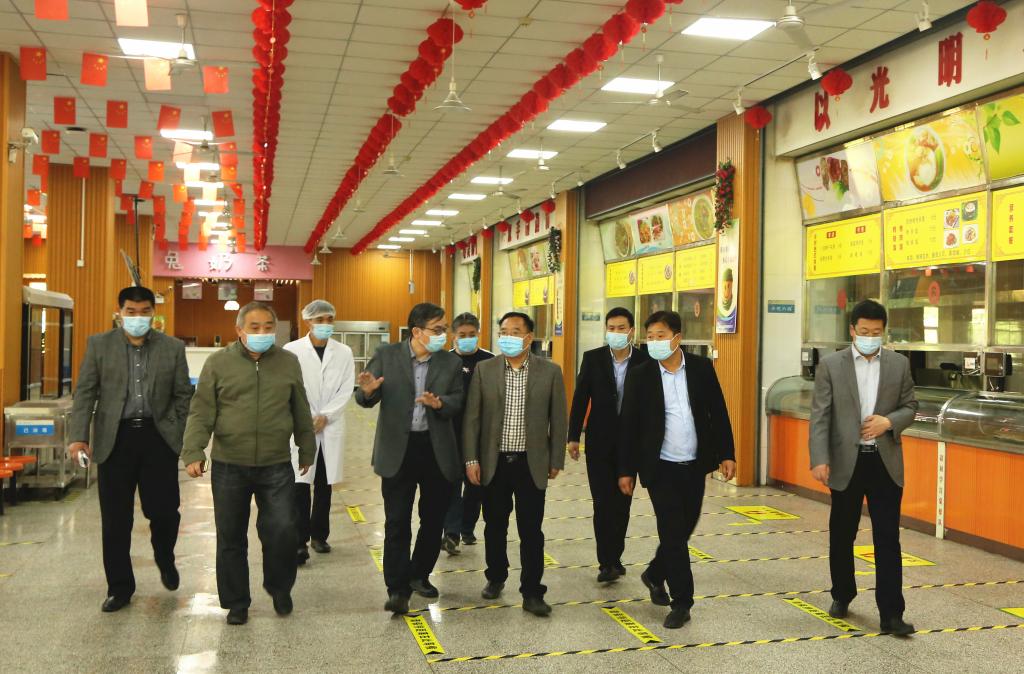 督查组一行先后来到阎良校区北大门、学生宿舍、校医院、食堂、浴室等场所,现场检查了解学校校园安全管理、公共区域卫生与消毒、防疫物资储备、隔离房间准备、食堂错峰就餐管理等工作。