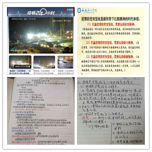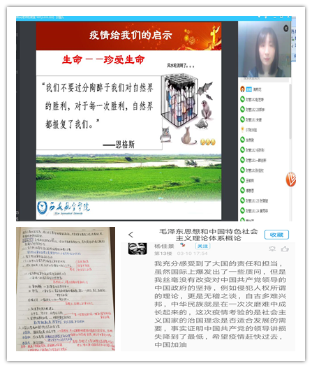 线上教学开展以来,马克思主义学院始终坚持线上学习与线下课堂教学同质等效,做到“标准不降低,学习不停顿”。思政课新模式受到了学生的接受和喜爱,学生们纷纷表示原本“枯燥”“晦涩”的理论与眼前的现实问题相结合后,变得更为生动且更易于理解了。在接下来的教学中,马克思主义学院教师还将结合思政课教学与改革创新任务,继续讲好中国战“疫”故事,教育引导学生充分认识中国特色社会主义制度的显著优势,坚定“四个”自信,加强爱国主义教育、生命教育、法治教育、社会责任感教育、感恩教育等,教育引导广大青年勇做承担民族复兴大任的时代新人。