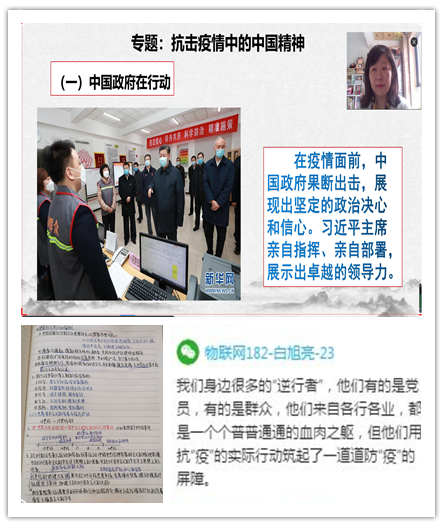 《毛泽东思想和中国特色社会主义理论体系概论》教研室积极发挥教师团队优势,延续“以老带新”的传统,在网络信息技术的运用中开创“以新帮老”的做法,强化团队合作。教学中结合教学内容和教学进度,通过集体备课的形式挖掘概论课与战“疫”的结合点,通过开展案例教学、线上讨论、案例微视频等多种手段,结合学生线上教学的实际积极开展有针对性的思政教学。李洁老师在授课过程中以近期社会热点——我国和国际社会在抗疫过程中的差异性作为主题,组织学生开展线上讨论,在互动交流辩论中,老师及时帮助学生明辨是非曲直,增强了学生对社会主义制度、理论等各方面的自信,坚定了广大青年学生走中国特色社会主义道路的信心,自觉为实现中国梦奉献青春、智慧和力量。李灵芝老师在讲授群众路线的时候,结合国内各地抗击疫情过程中涌现出的“硬核”标语和大量普通老百姓互帮互助的感人事迹,让学生明白人民群众是历史的创造者,人民群众是我们党和国家各项事业取得胜利的根本保证。