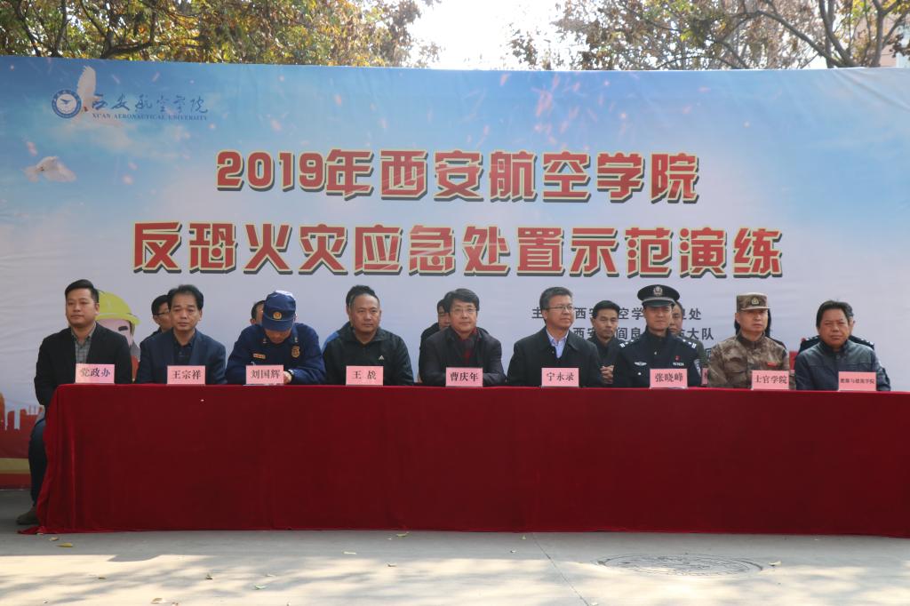 11月21日,2019年万博max体育官网入口反恐火灾应急处置示范演练在阎良校区举行。校长曹庆年、副校长宁永录,西安市公安局阎良分局国保大队、蓝天路派出所、西安市阎良区消防大队,学校保卫处、党政办、教务处、学生处、校团委、后勤保障处、校办工厂、图书馆及阎良校区各二级学院有关负责人及300余名师生现场观摩演练。演练由保卫处主办,士官学院及能源与建筑学院承办。