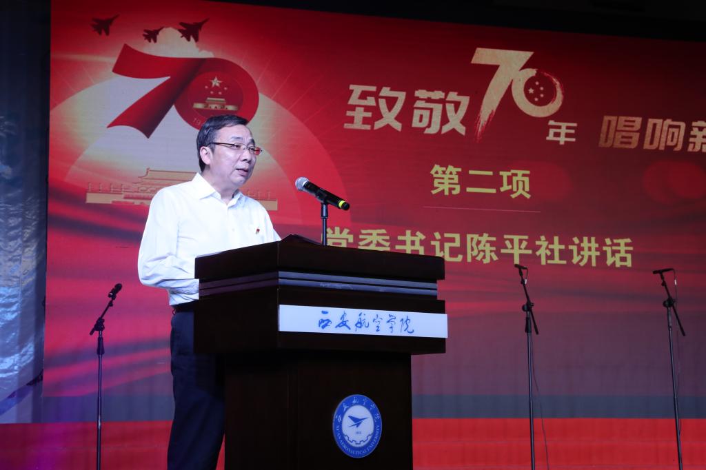 党委书记陈平社致辞。他表示,70年来,我们党不忘初心、牢记使命,团结带领全国各族人民,开辟了中国特色社会主义道路,谱写了一部感天动地的奋斗史诗。60多年来,学校发展始终与祖国的发展、国家航空事业的发展同向同行,一代代西航人把学校精神与国家使命融为一体,爱校荣校、敢为人先,艰苦创业、接续奋斗,为我国航空工业建设和陕西经济社会发展作出了重要贡献。在新中国70周年华诞来临之际,衷心祝愿我们伟大的祖国更加繁荣富强!祝愿学校事业更加灿烂辉煌!陈平社要求,学校发展正处在爬坡过坎、奋力追赶超越的关键期,迎评促建、接受教育部本科教学工作合格评估的决战期,全体西航人要不忘育人初心,牢记报国使命,以中国航空110周年、新中国成立70周年为标记,重整行装再出发,奋力走好学校高水平建设发展新的长征路,为建设特色鲜明的高水平应用型高校努力奋斗!