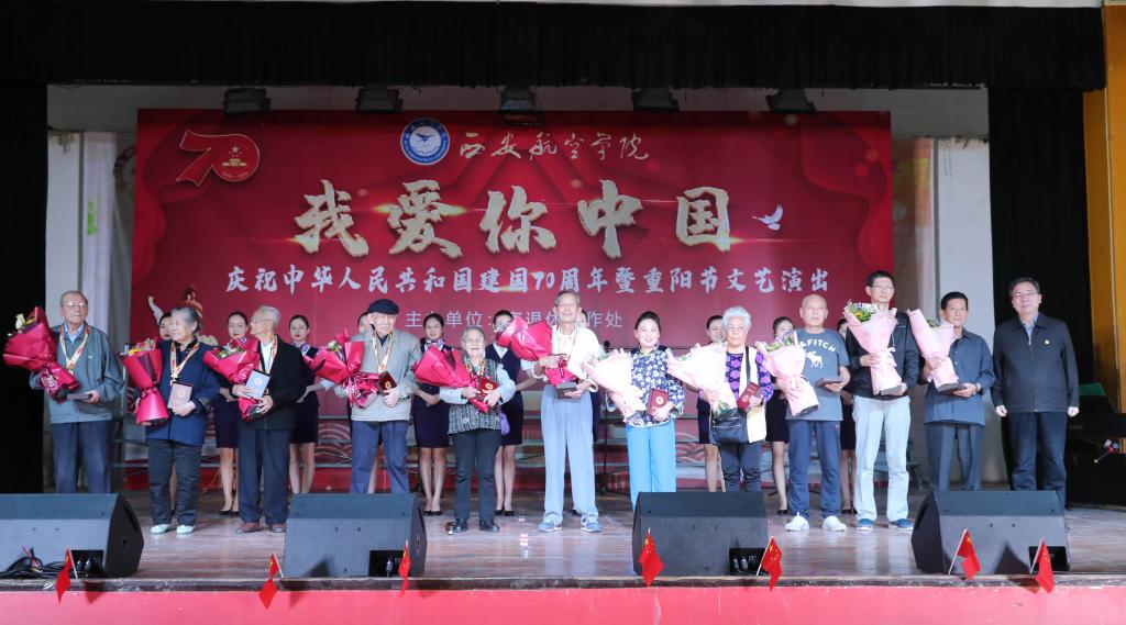 陈平社为获得殊荣的11位离休老同志逐一颁发纪念章。他在致辞中指出,70年来,在中国共产党的坚强领导下,我们的国家进行了社会主义革命、建设、改革等一系列艰辛探索,实现了站起来、富起来到强起来的伟大飞跃。我们的学校是随新中国航空工业同期布局的一所培养应用型人才的学校,64年来,伴随着国家发展而发展,在座的许多老领导、老同志、老教师都把自己的一生献给了祖国的教育事业,献给了学校的建设发展,历史将不会忘记你们的奉献与功绩,学校将感恩你们的付出和贡献。当前学校的事业发展正处在爬坡过坎的关键期,迎评促建的攻坚期,希望广大离退休老领导、老同志、老教师能够继续发挥余热,关注学校事业发展,对学校各方面工作多提宝贵意见,多作贡献。