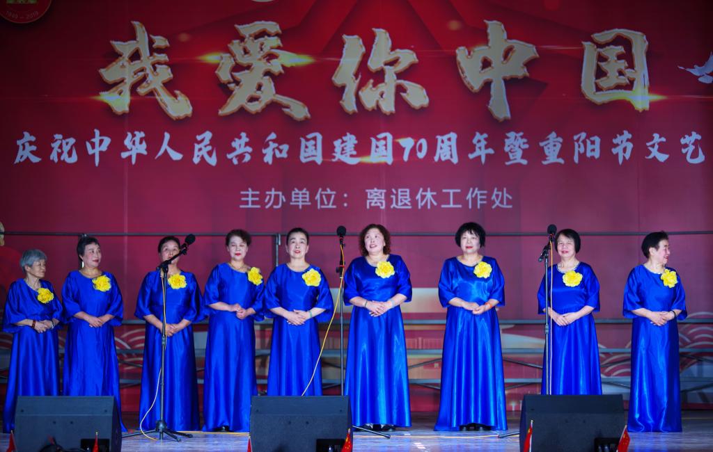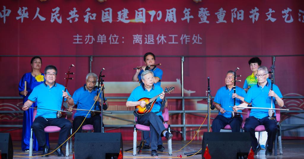 随后,演出正式开始。老年艺术团表演的大合唱《一支难忘的歌》使大家沉醉在过去岁月的记忆中;《突破封锁线》铿锵有力地将革命历史再现,把我们带回到红军艰苦卓绝、浴血奋斗的年代;蓝汝明老师的一首手风琴曲《今天是你的生日我的祖国》表达了退休老教师对伟大祖国繁荣昌盛的无限赞美;舞蹈队表演的《大红枣送亲人》展示了战争年代军民鱼水情的美好场景;李玉林、王宏的诗朗诵《祖国颂》把祖国70年的历史进程定格在这一瞬间;柔力球协会表演的《光荣和梦想》把退休职工老有所为、老有所乐的运动精神完美展现;罗红的一曲女声独唱《我和祖国》用动情的演唱引起了台下的共鸣;由旗袍协会表演的《女人花》在优美的音乐以及折扇、明伞的衬托下款款而来,展现了退休职工温柔似水的一面......