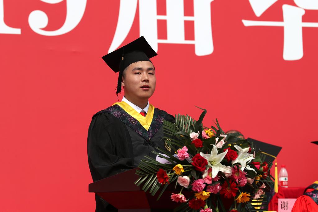 毕业生代表王博豪分享了四年来在西航生活、学习、奋斗的经历与感受,感谢恩师的谆谆教诲,感恩母校带给他成长的蜕变,倡议全体毕业生不忘初心,秉承“德能日新,刚健有为”的校训,为建设社会主义现代化强国作出自己的贡献。