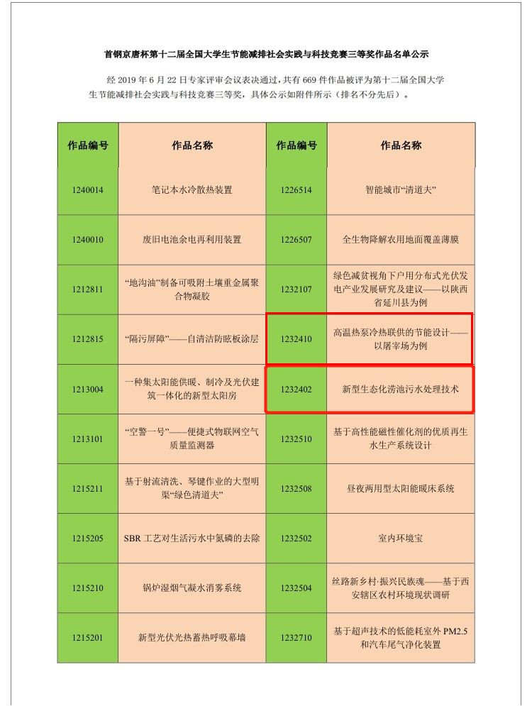 第十二届全国大学生节能减排社会实践与科技竞赛网评环节于近日落下帷幕。万博官网能源与建筑学院学生吴瑞等报送的《高温热泵冷热联供的节能设计——以屠宰场为例》和杨睿等报送的《新型生态化涝池污水处理技术》两项作品成功入围,荣获国家级三等奖,取得了万博官网在该类竞赛上的历史性突破。