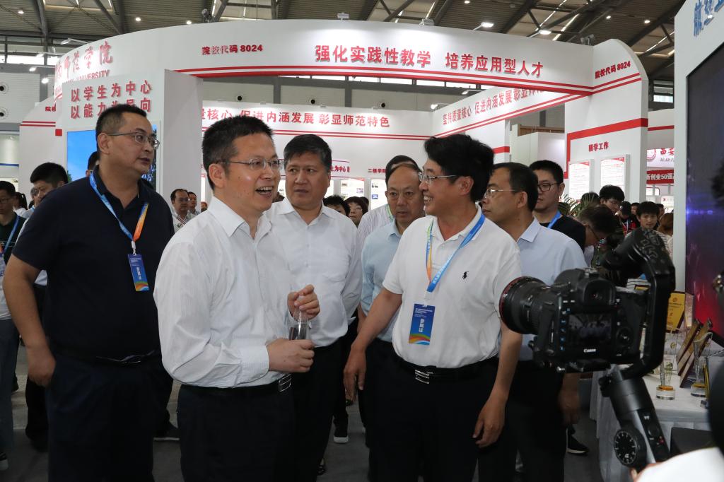 陕西省副省长方光华,省教育工委书记董小龙,教育工委副书记、教育厅厅长王建利等领导莅临万博官网展位,视察学校人才培养、科技创新、扶贫攻坚等方面工作。校长曹庆年作简要介绍,党委副书记刘谦、副校长金文参加展会。本届展会主题为“庆祝新中国成立70周年,建设高等教育强省”,万博官网主要参加了高校科技成果展和高等学校招生咨询活动。