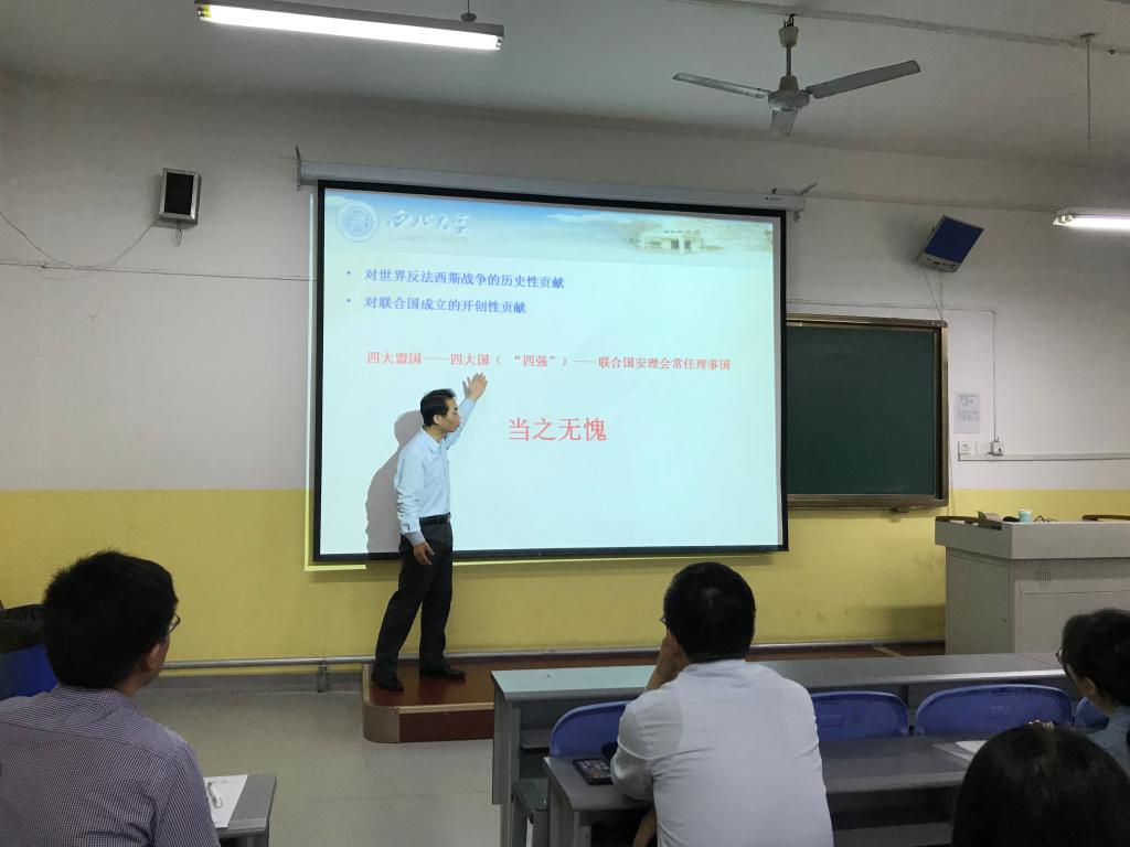 苟昭赟以《近代中国“大国地位”是真的吗?》为题展开示范教学。苟老师着重讲授了三点:一是近代中国大国地位确立的“三级跳”;二是近代中国大国地位确立的原因;三是近代中国大国地位的两个特点。苟老师的授课结构清晰、方法灵活、有理有据,有助于开阔学生视野,引发学生深入思考,整个授课内容逻辑性强,环环相扣,层层递进,娓娓道来,自然流畅。特别是他能从一位思政课教师的课堂情怀入手,引出作为一名思政课教师应通过全身心备教材、备内容、备学生等过程备好一堂课;注重通过以情动人、以理服人讲好一堂课。