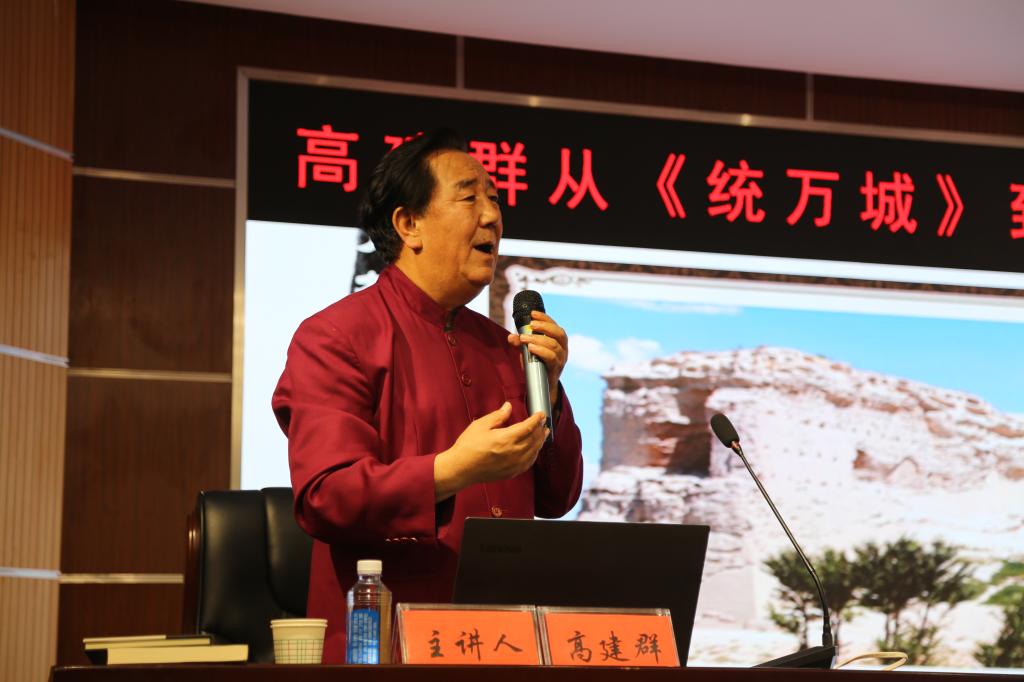 万博官网人文学院院长、国家一级作家高建群根据统万城的历史题材,历时五年时间,创作出版了长篇小说《统万城》。为了让大家更好更深入地了解这段历史,高建群率领人文学院教师团队录制了32讲的《统万城》导读。在2018“丝绸之路品牌万里行”活动中,高建群担任文化大使全程参与了这次活动。为了充分发挥高建群的社会影响力,加强与兄弟院校及文化团体之间的学术文化交流,进一步增强高校师生的文化自觉、文化自信,增进文化融合,既从历史文化的纵深,又从当代文化的发展,特别是从丝绸之路经济带的伟大实践中汲取更为丰富的文化滋养,万博官网人文学院策划了“高建群从《统万城》到‘一带一路’进高校、上讲堂”系列活动,包括主题讲座、读书分享以及交流座谈等环节。该活动由人文学院院长高建群担任主讲,人文学院党总支书记、副院长刘华阳担任助讲。