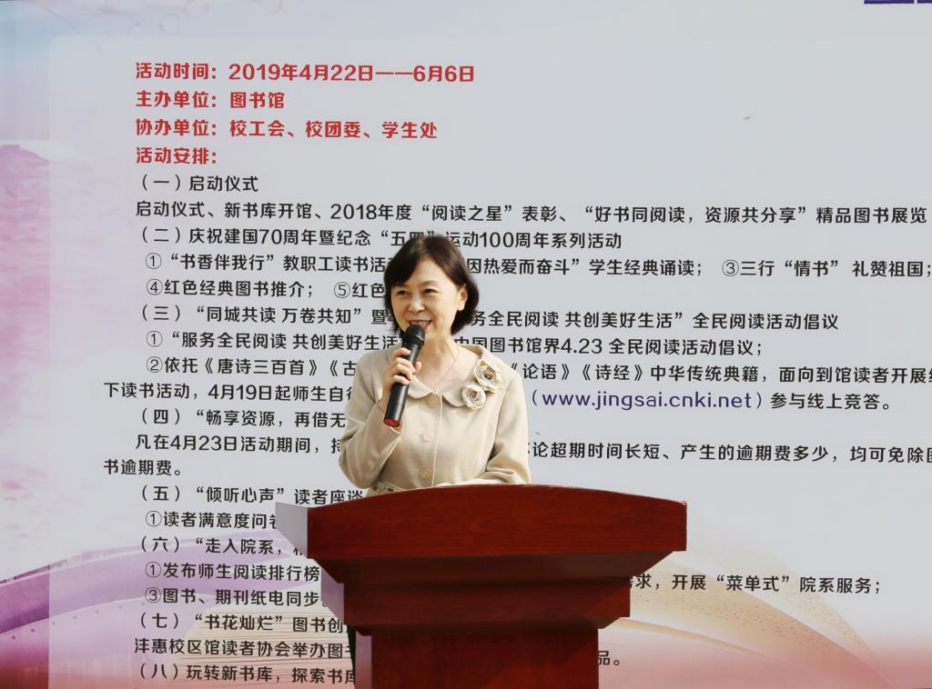 启动仪式上,图书馆馆长郑东红介绍了本届读书节的活动安排。本届读书节围绕庆祝中华人民共和国成立70周年暨纪念“五四”运动100周年、弘扬中华优秀传统文化主线,组织开展形式多样、内容丰富的活动,包括庆祝中华人民共和国成立70周年暨纪念“五四”运动100周年系列活动、“同城共读 万卷共知”暨4·23“服务全民阅读共创美好生活”全民阅读活动倡议、4·23让图书回家、数字资源系列培训、“倾听心声”读者座谈会、“走入院系,精准服务”、“书花灿烂”图书创意造型大赛、玩转新书库、线上线下读书分享、与西北工业大学图书馆开展信息咨询服务合作等。