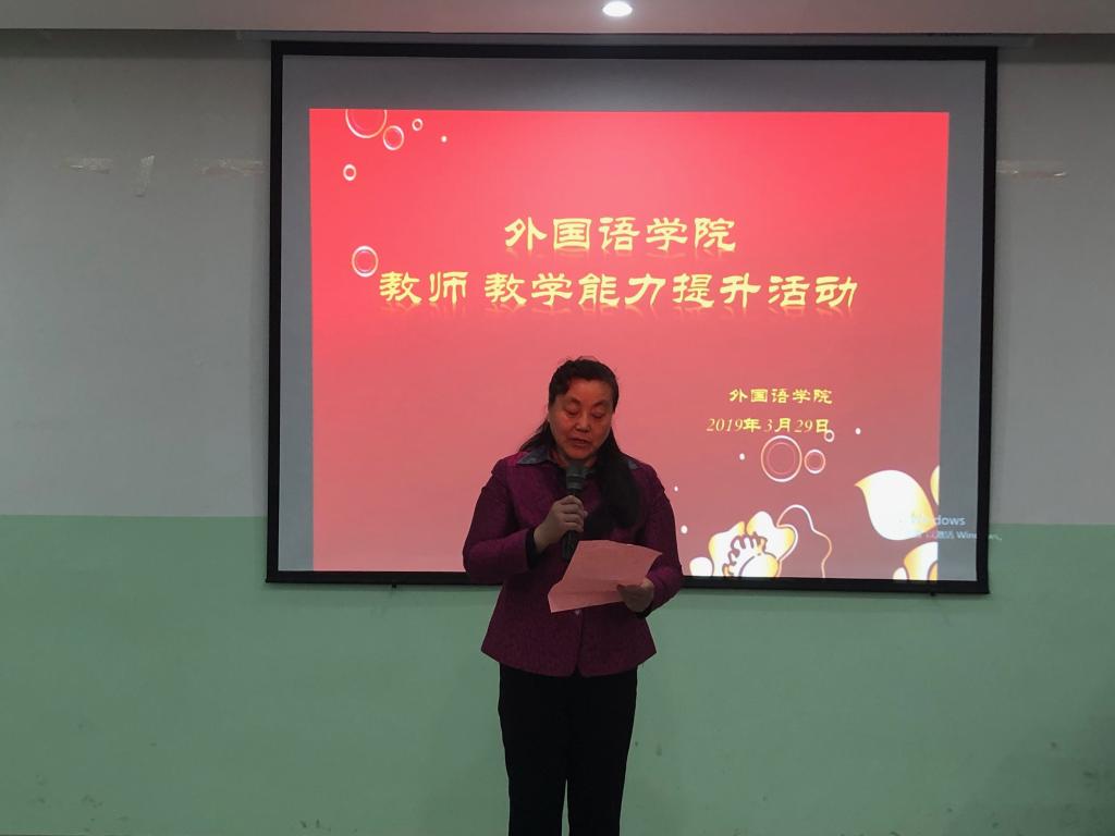 谭少敏在活动前讲话,希望外国语学院全体教师通过教学能力提升活动,坚持学科特色,认真落实课改要求,在教学中重视学生学习潜力的挖掘和和实践锻炼,不断提高教学水平,大力提升万博官网四六级通过率,为万博官网的内涵发展作出贡献。