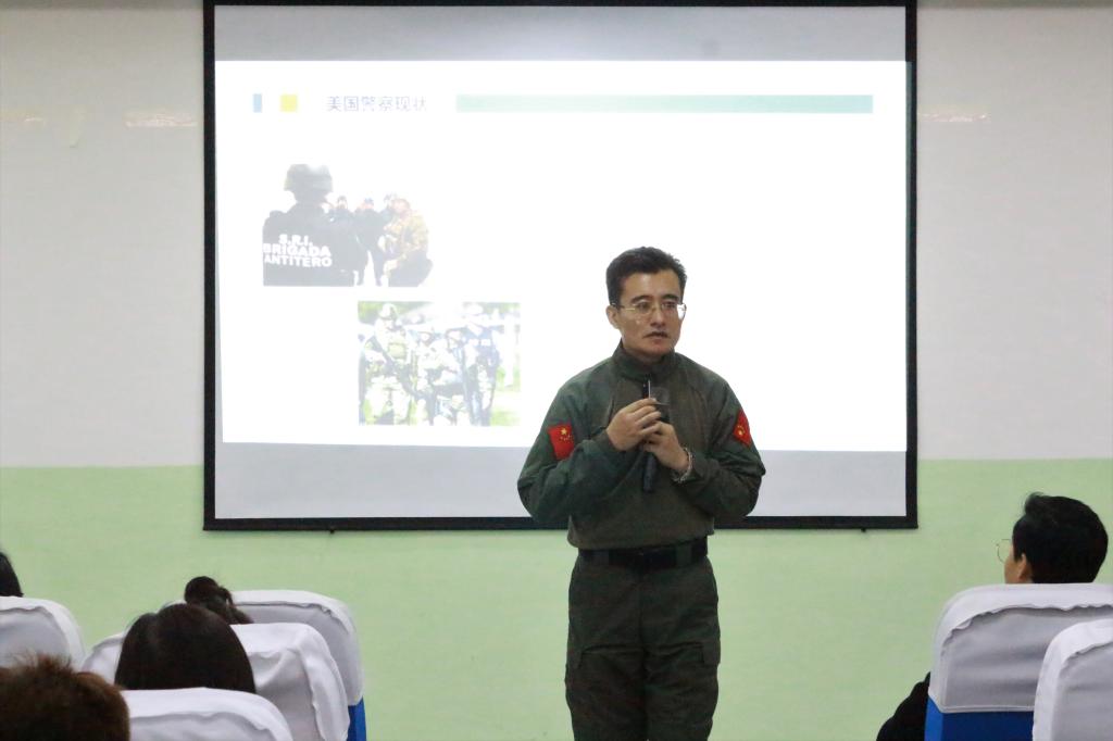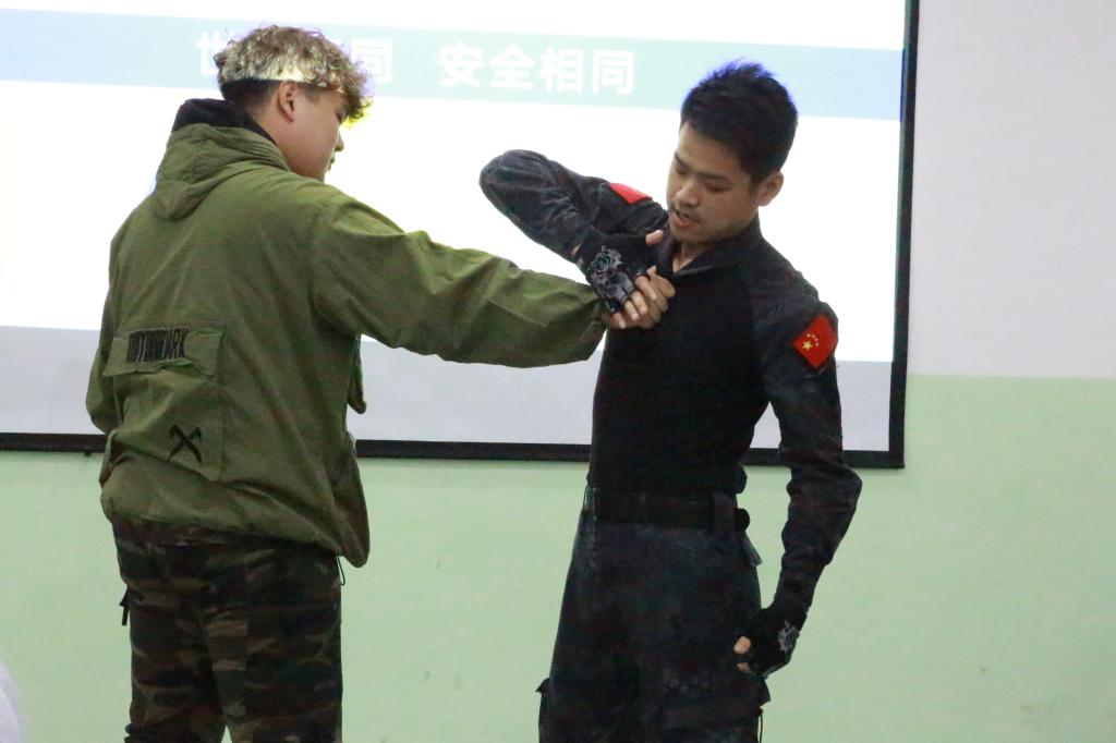 王学军从自己的维和与救援经历谈起,围绕安全意识培养、远离风险能力、智慧避险能力、紧急脱险能力培养等四个方面,结合多年海外学习、维和工作经验,利用丰富生动的案例,讲解了海外常见社会风险、发达国家法律风险解析和应对警察执法、防范应对校园性骚扰和性侵害、留学生心理问题预防与调整、车辆行驶安全以及应对枪击和爆炸等公共安全事件的技巧。并与助手陈教官亲身试教,演示安全防护技能,展示了正确的安全急救措施和紧急自卫术,简单分解了“一招制敌术”。师生们积极跟着陈教官进行模拟演练,掌握了简单易行的自卫本领。