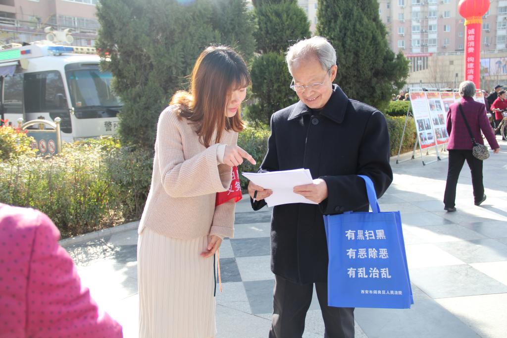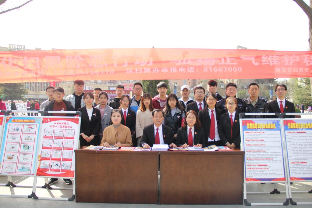 为深入贯彻落实党的十九大部署和习近平总书记重要指示精神,响应国家“扫黑除恶”专项工作的号召,教育和引导万博官网大学生遵纪守法、主动维护社会安定有序。3月15日,阎良区人民法院在阎良区千禧广场开展了“扫黑除恶行动,弘扬正气维护秩序稳定”专项宣传活动。阎良区人民法院副院长李哲、刑事庭庭长丁琼琼及相关工作人员,万博官网辅导员王嘉雨老师及学生宣讲志愿者共同参加了此次活动。