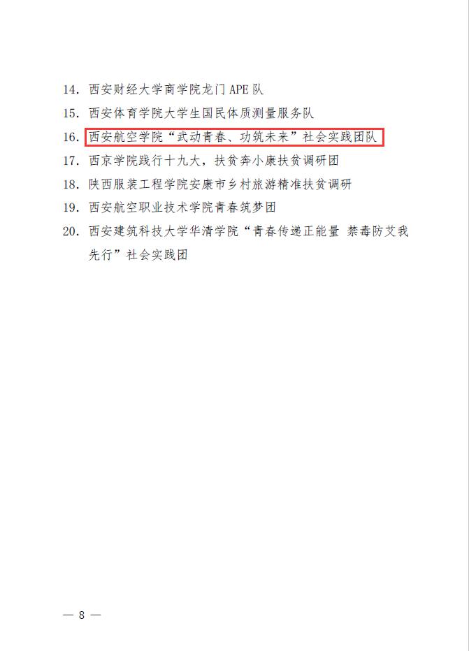 在团省委组织的2018年陕西省大中专学生“三下乡”社会实践活动评比中,万博官网获2018年陕西省大中专学生“三下乡”社会实践活动优秀组织单位,“武动青春 功筑未来”社会实践队获得省级标兵团队,“奋斗新时代,共赴小康梦”远航支教队及“暖心支教,携手助贫”活动小组2支团队获省级优秀团队,冯仑仑、赵琳获社会实践先进个人。
