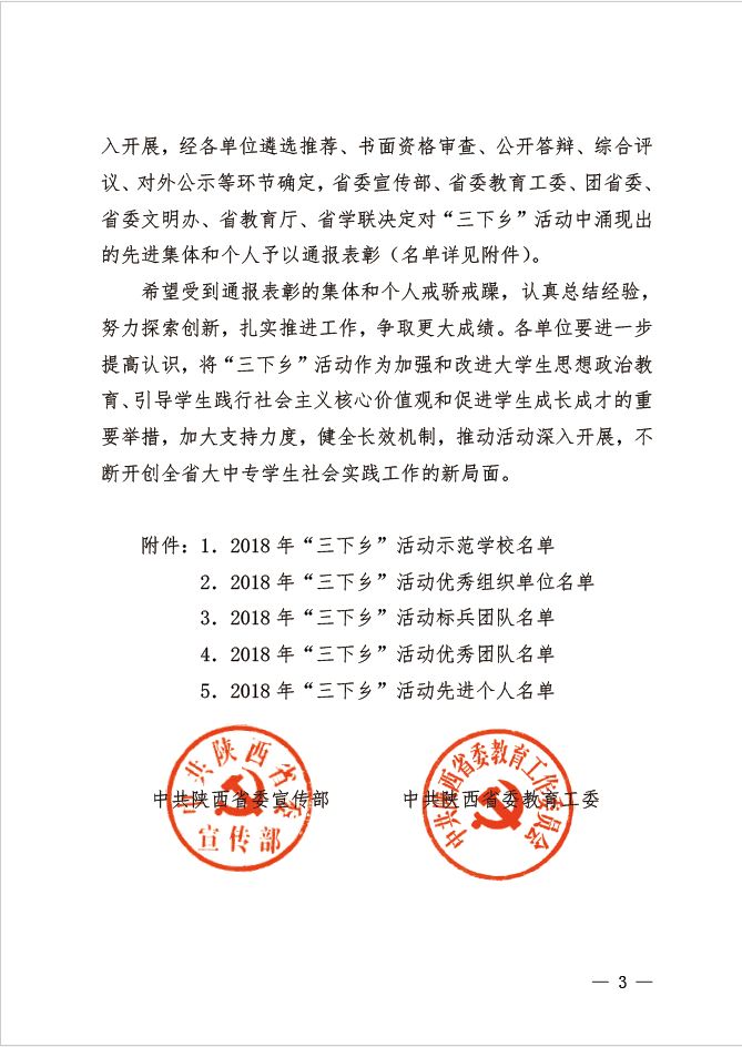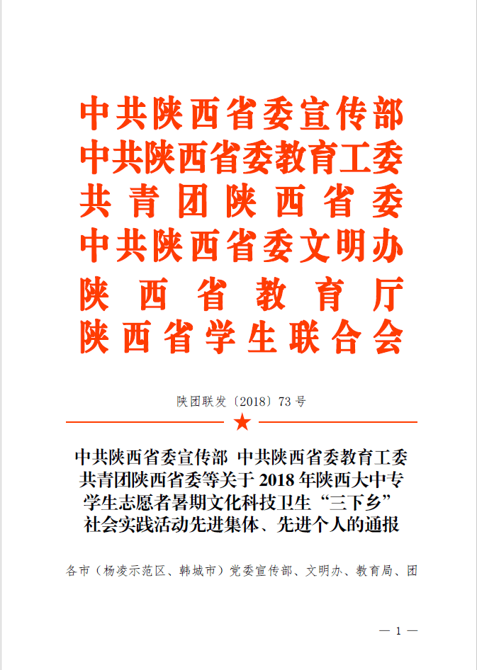 近日,省委教育工委、团省委对2018年陕西省大中专学生“三下乡”社会实践活动及“万名学子扶千村”大学生暑期社会实践扶贫攻坚专项活动评比结果进行公示,万博官网荣获多项省级荣誉。