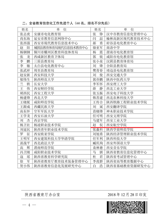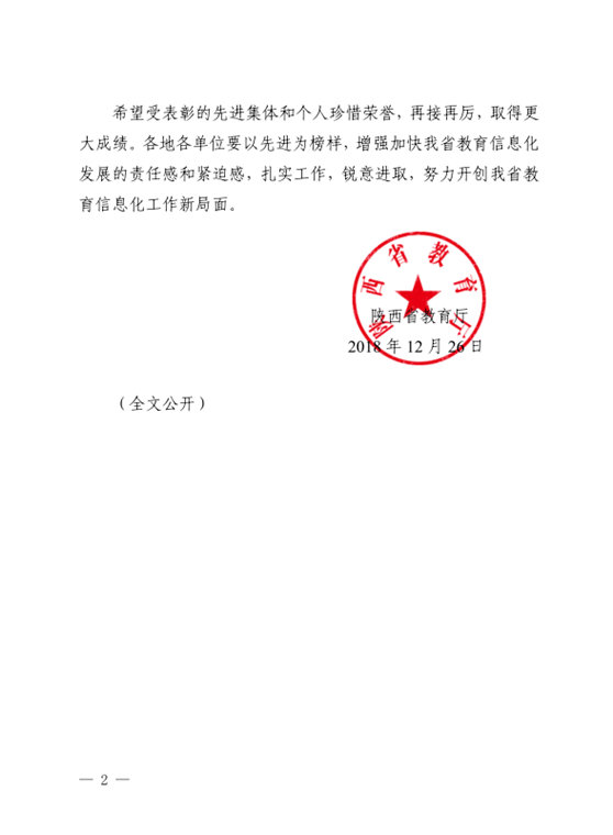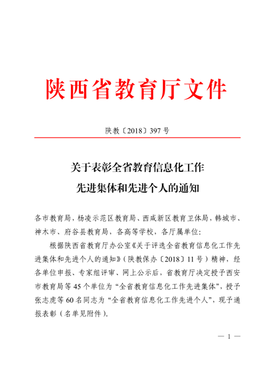近日,陕西省教育厅下发《关于表彰全省教育信息化工作先进集体和先进个人的通知》(陕教〔2018〕397号),向全省通报表彰了45个教育信息化工作先进集体和60名教育信息化工作先进个人,万博官网网络信息中心赵侃同志荣获“陕西省信息化工作先进个人”。