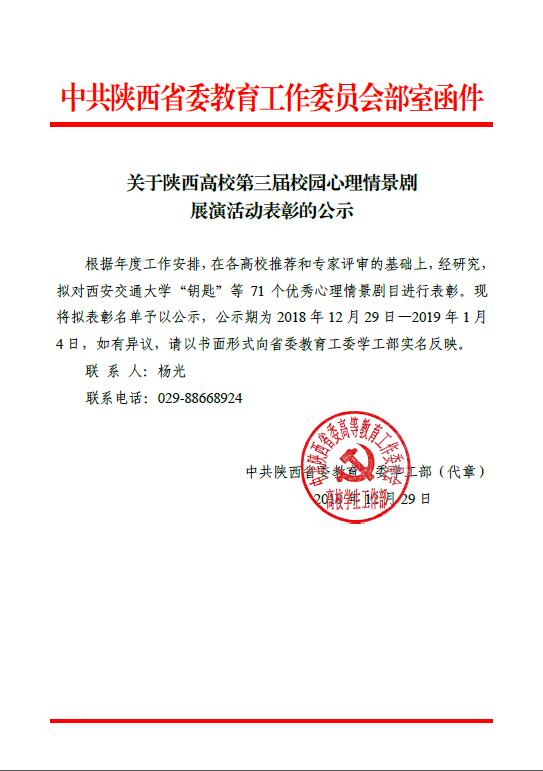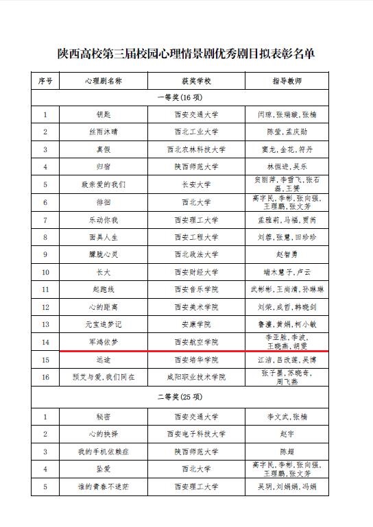近日,省委教育工委对全省高校第三届校园心理情景剧展演活动成绩予以公示,万博官网推荐的《军鸿依梦》和《新光阴的故事》两部作品分获一等奖和三等奖。