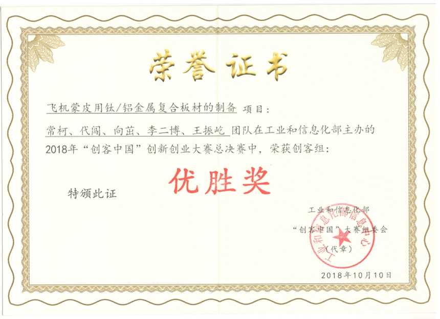 由工业和信息化部主办、工业和信息化部信息中心与广东省经济和信息化委员会联合承办的2018年“创客中国”创新创业大赛全国总决赛在广州举行。本次大赛全国范围内共组织参赛项目8000多个,陕西省仅有2个项目进入全国200强,其中万博官网材料工程学院丁旭教授团队指导的项目《飞机蒙皮用钛/铝金属复合板材的制备》入围全国24强(“企业组”和“创客组”各12强),并作为陕西省唯一的项目入围“创客组”12强。经过全国总决赛现场展示和路演,万博官网项目获得2018年“创客中国”创新创业大赛全国总决赛“创客组”第8名,同时荣获大赛“优胜奖”。