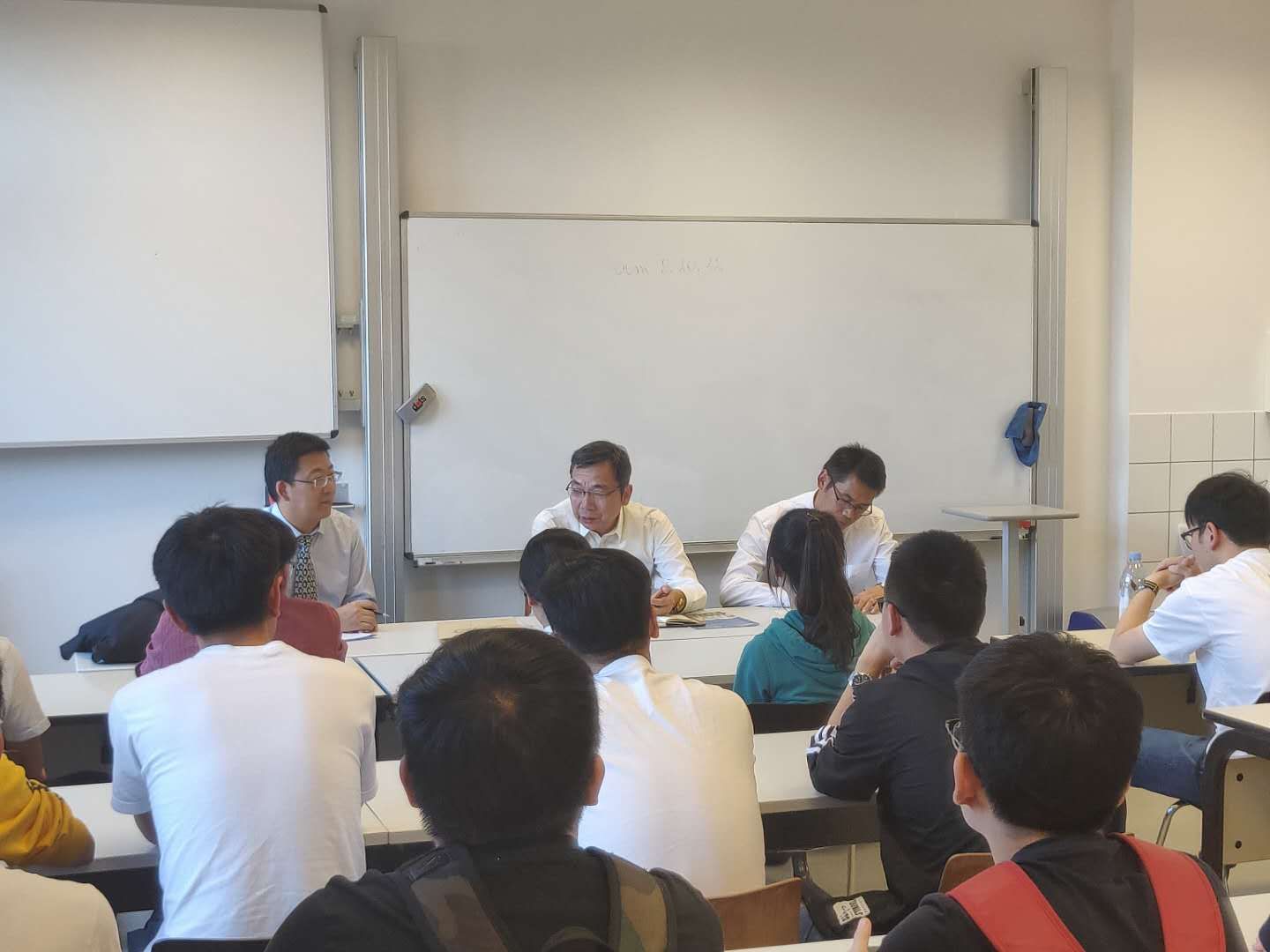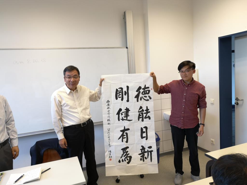 陈平社一行还专程看望了万博官网中德合作班在德学习学生,并召开座谈会,详细了解同学们在德学习期间思想、学习、生活等方面的情况,勉励大家要珍惜时光、团结奋斗、爱国爱校、树立形象、肩负责任,并送上“德能日新,刚健有为”校训亲笔书法和中秋节的问候。