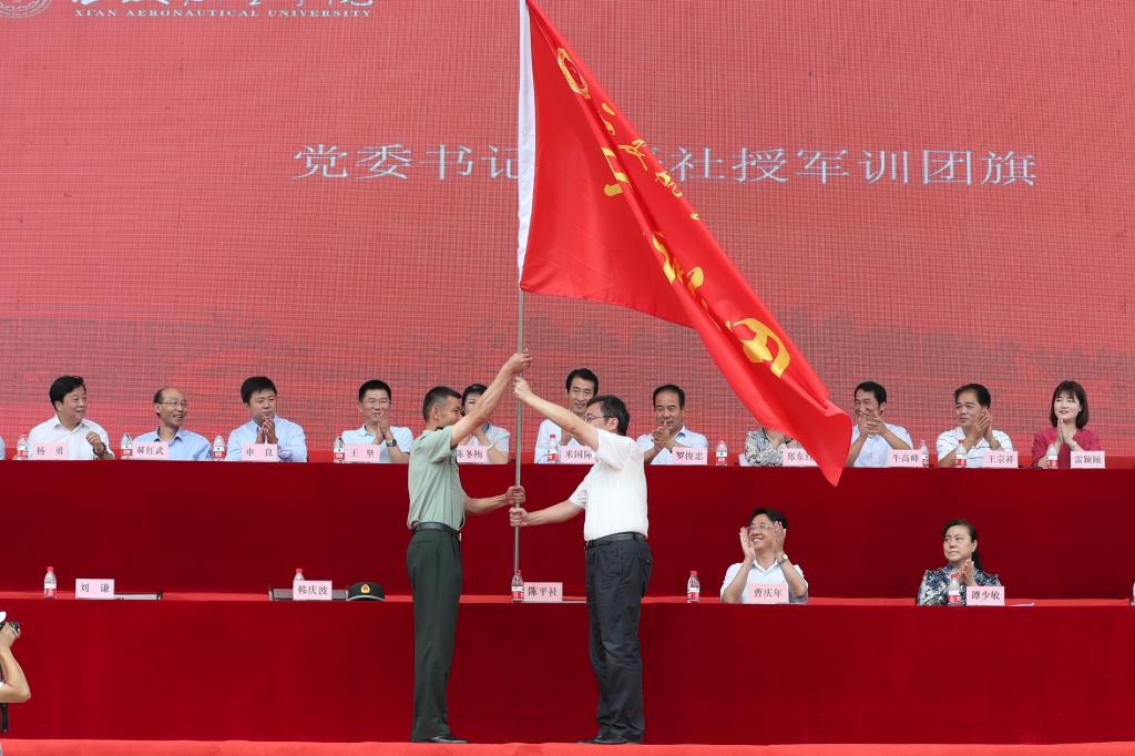 陈平社书记向万博官网2018级新生军训团授团旗。全体校领导向军训团各营授营旗。