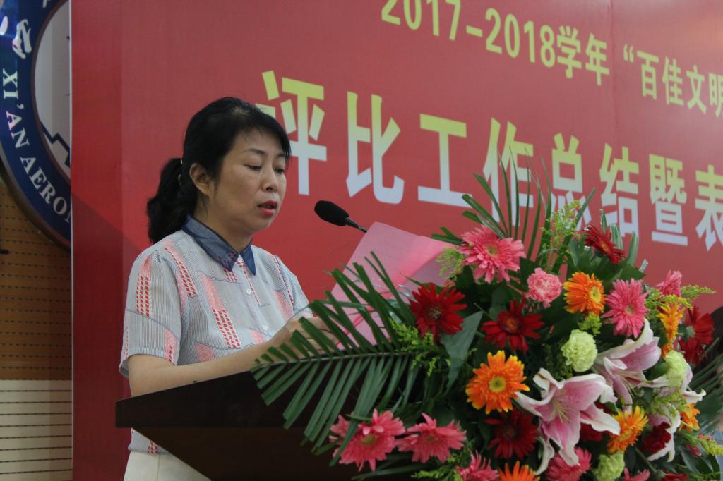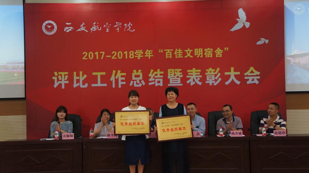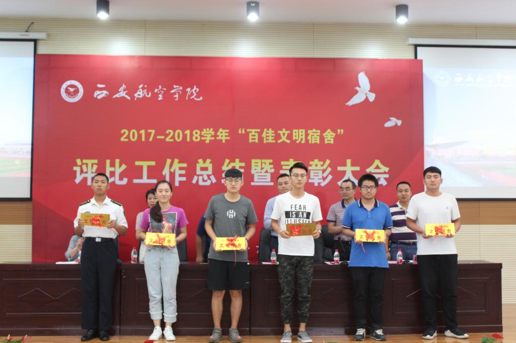 后勤保障处处长陈冬梅宣读了《关于2017-2018学年“百佳文明宿舍”评比的表彰决定》,共表彰“学风标兵宿舍”20间、“文明标兵宿舍”20间,“文明宿舍”60间,“优秀舍长”20名。机械工程学院、计算机学院获“优秀组织奖”。与会领导分别为获奖集体和个人颁奖。飞行器学院学生代表崔志健作为文明标兵宿舍发言。