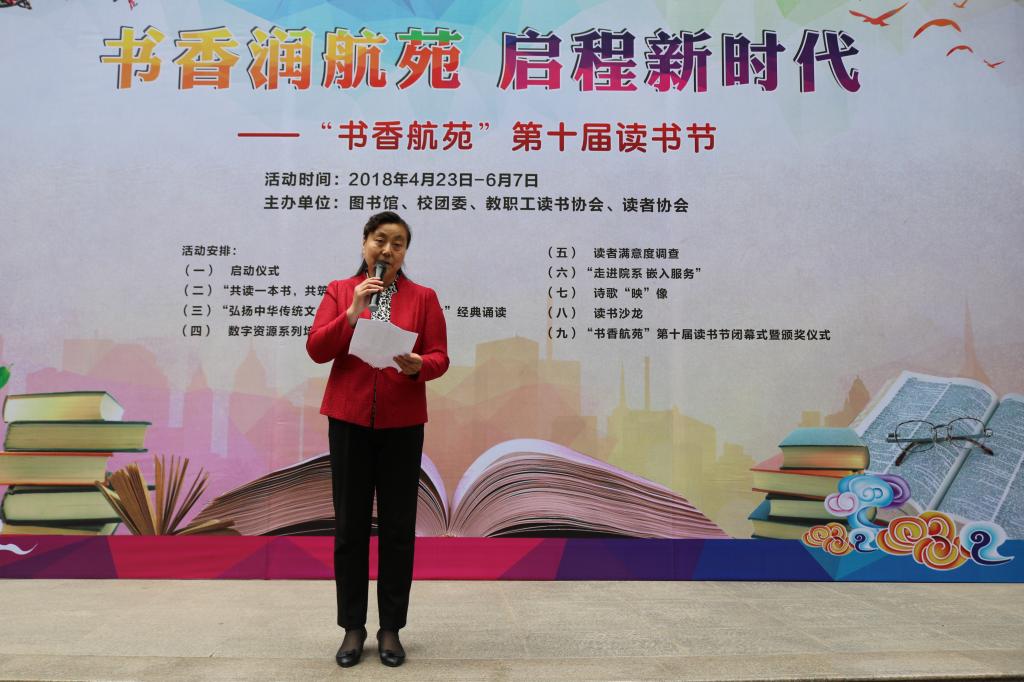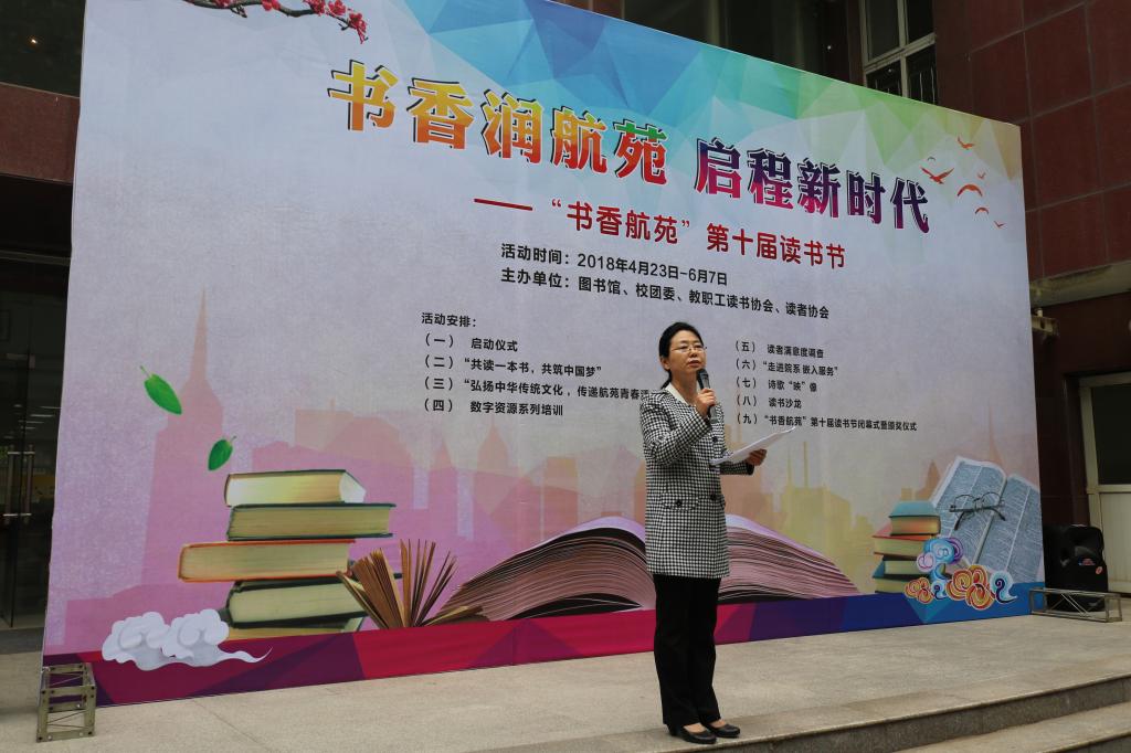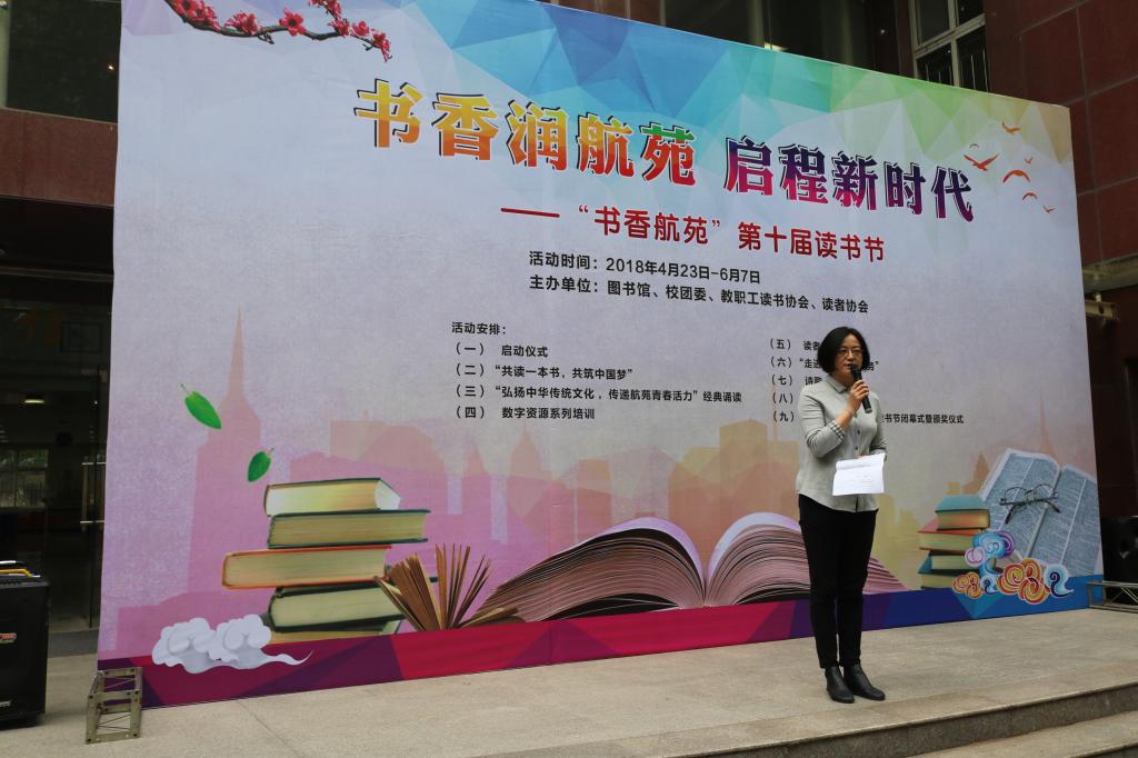 随后,图书馆副馆长刘文哲介绍了本届读书节活动安排。读书节活动内容包括启动仪式、“共读一本书,共筑中国梦”共读活动、“弘扬中华传统文化,传递航苑青春活力”经典诵读、数字资源系列培训、“走进院系,嵌入服务”院系座谈、诗歌“映”像摄影书画大赛、读书沙龙、“书香航苑”第十届读书节闭幕式暨颁奖仪式等,她希望广大师生都能热情地参与进来,用传统文化修身,用阅读明智,在书香中提升自我。