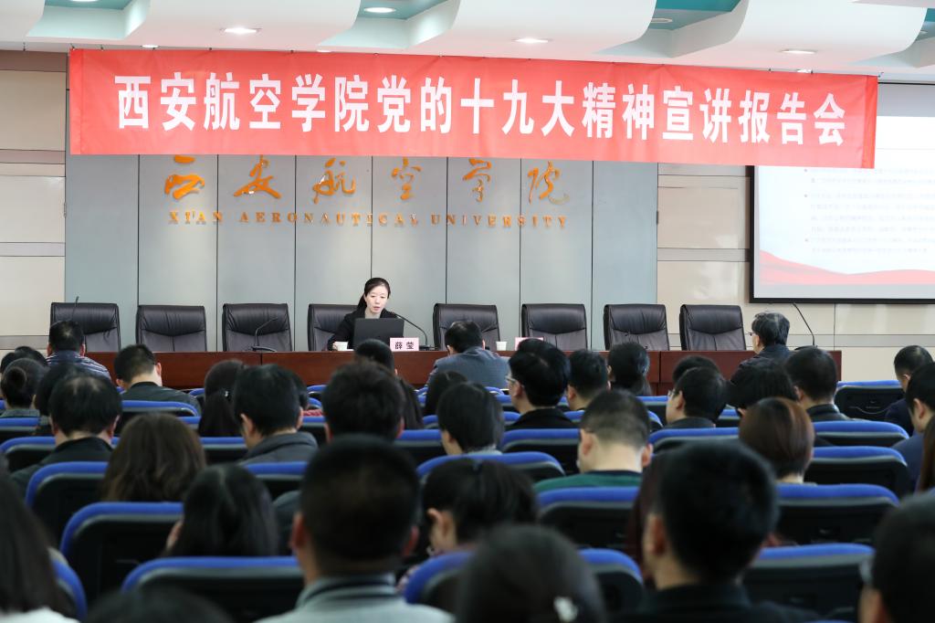 11月24日,党的十九大代表、2017年全国敬业道德模范、航空工业西飞国航厂“薛莹班”荣誉班长薛莹同志应邀来万博官网宣讲党的十九大精神。学校科级以上干部、思政课教师、辅导员及学生代表参加报告会。会议由校党委书记陈平社主持。