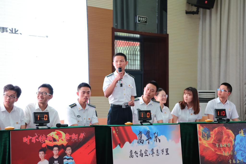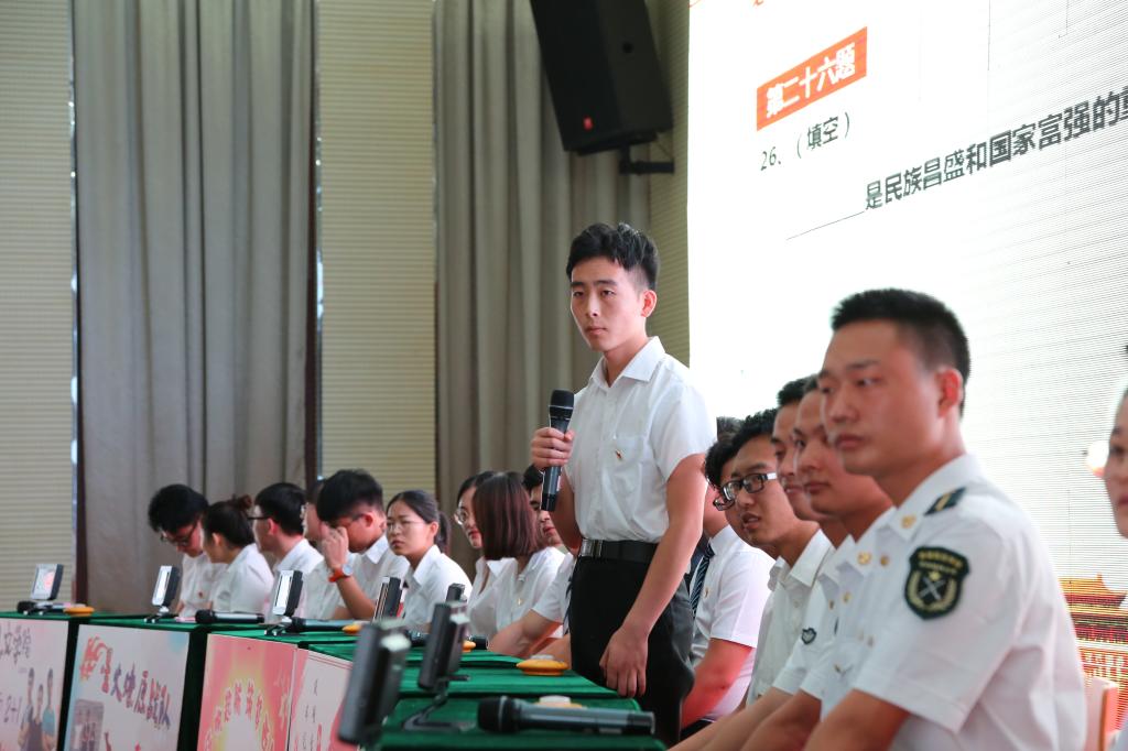 全体与会师生庄严宣誓,重温入党誓词。经过初赛和复赛选拔,7支代表队脱颖而出进入决赛,决赛现场各参赛选手精神饱满、奋勇争先、大展风采。必答题环节沉着稳定,抢答题环节灵敏机智,冒险闯关环节勇往直前,选手们以丰富的知识储备和精彩的表现赢得现场观众阵阵掌声。比赛间隙还设有易班平台观众互动环节,现场观众热情高涨、踊跃参与,气氛十分活跃。经过激烈的角逐,最终电子工程学院代表队获得一等奖,士官学院代表队、人文学院代表队获得二等奖,外国语学院代表队、机械工程学院代表队、计算机学院代表队、经济管理学院代表队获得三等奖。