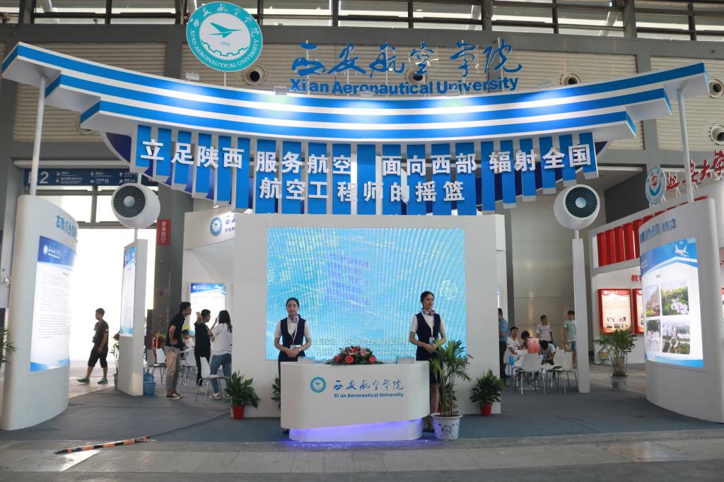 万博官网展区位于国际会展中心B2馆,设计以航空蓝色为主色调,以学校基本情况、招生章程、特色招生、招生计划及二级学院情况简介为布展内容。