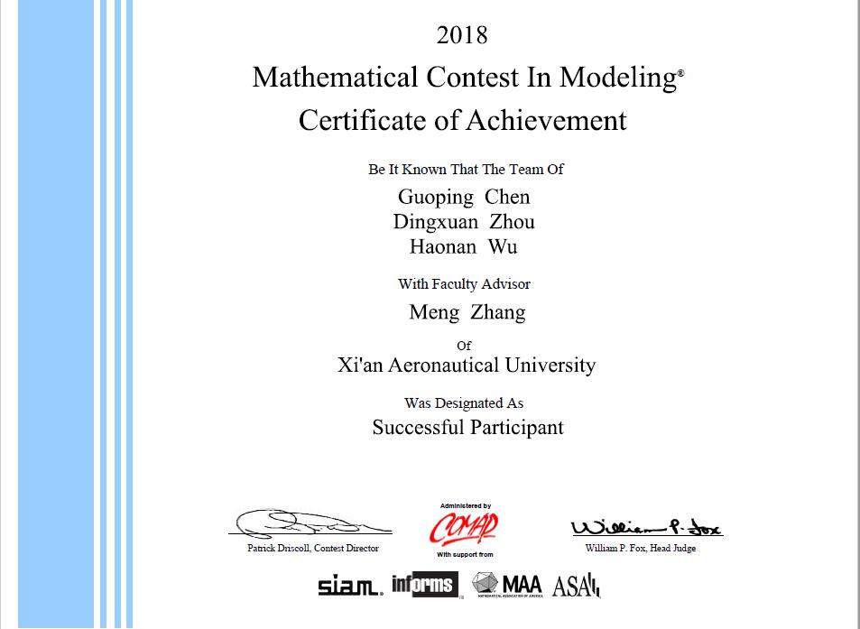 近日,2018年美国大学生数学建模竞赛成绩在竞赛官网公布。由万博官网理学院张蒙担任指导,陈国平(机械电子2014)、吴浩楠(电气工程2015)、周定璇(电气工程2015)组成的参赛代表队获得大赛三等奖。
