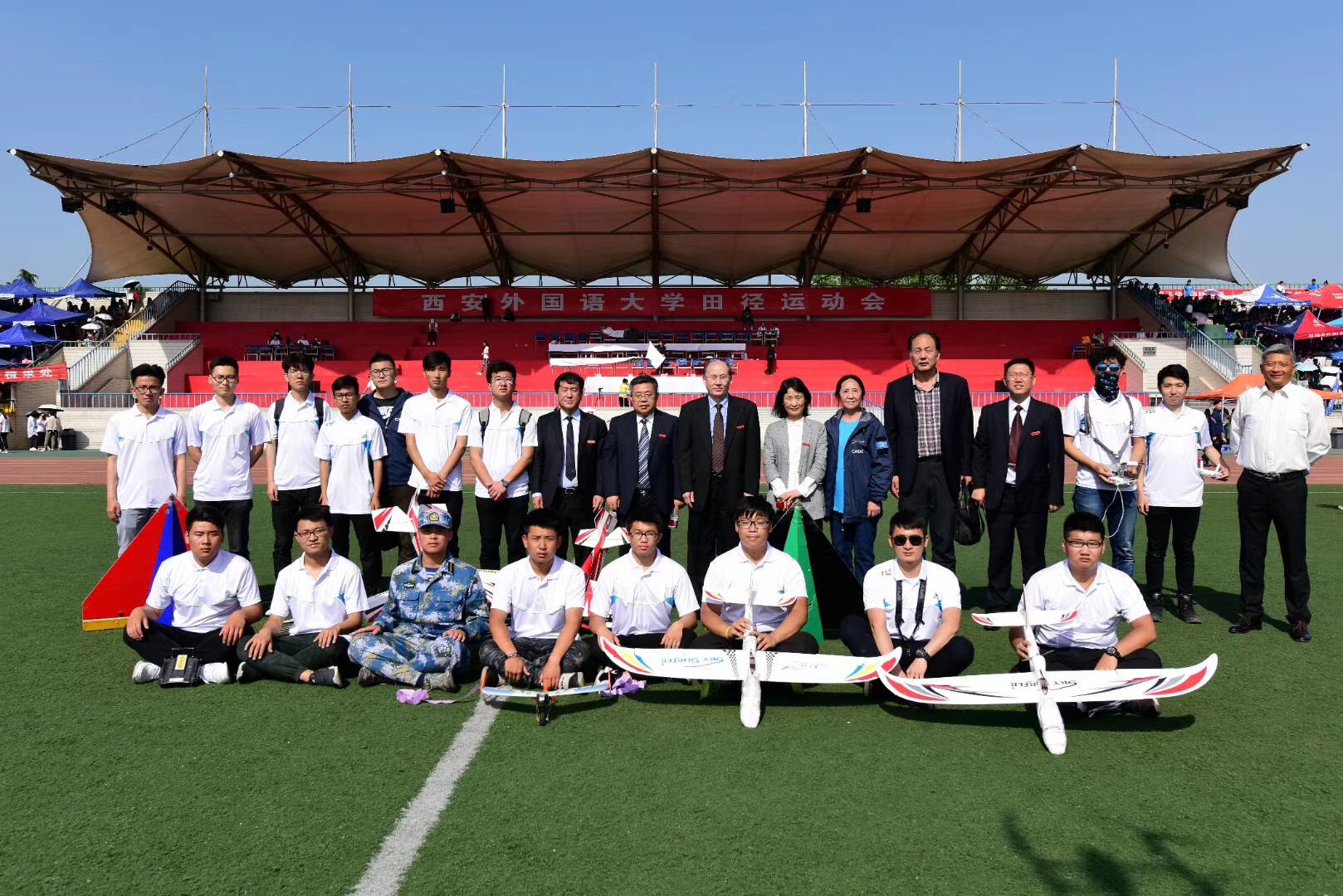 4月27日,万博官网航模队25名队员在体育部主任吴小茂、航模队指导教师李红军的带领下赴西安外国语大学长安校区参加西安外国语大学校运会开幕式并作飞行表演。