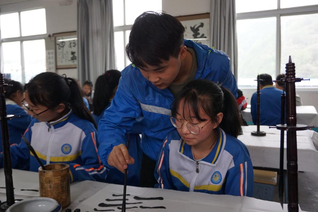 书画社成员向同学们详细介绍了书画的基本知识及书画渊远的文化历史。他们与同学们一起动手书写,手把手地教同学们如何书写毛笔字,鼓励同学们积极传承和弘扬中华民族传统文化。