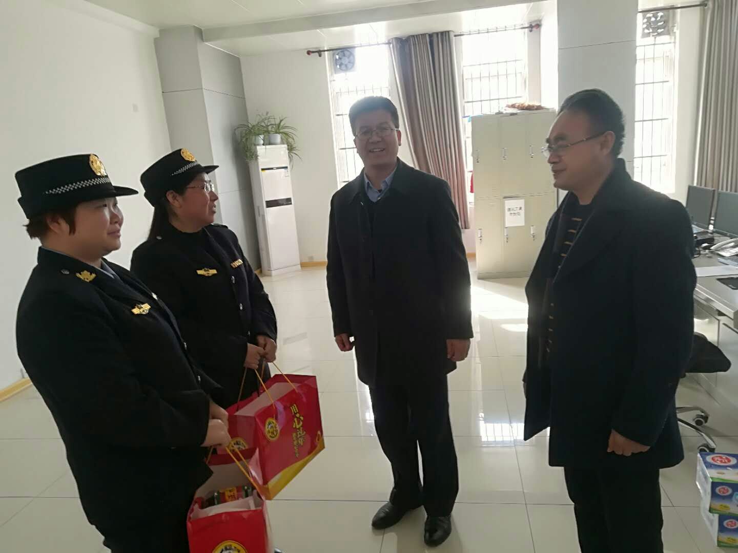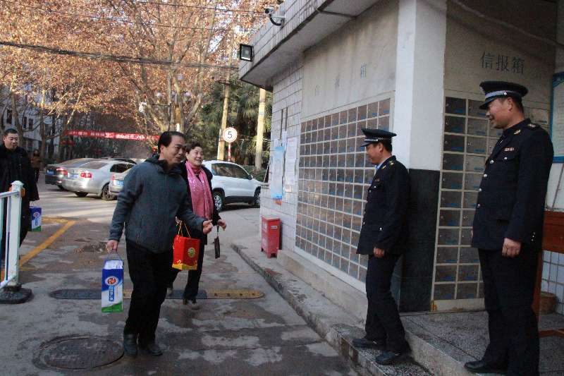 校领导一行先后到保卫处、动力中心、公寓楼、卫生所、车队等各值班点,与坚守在工作岗位的值班人员一一握手问好,对大家的辛勤工作表示真挚感谢,并送上慰问品,祝愿大家新春快乐。