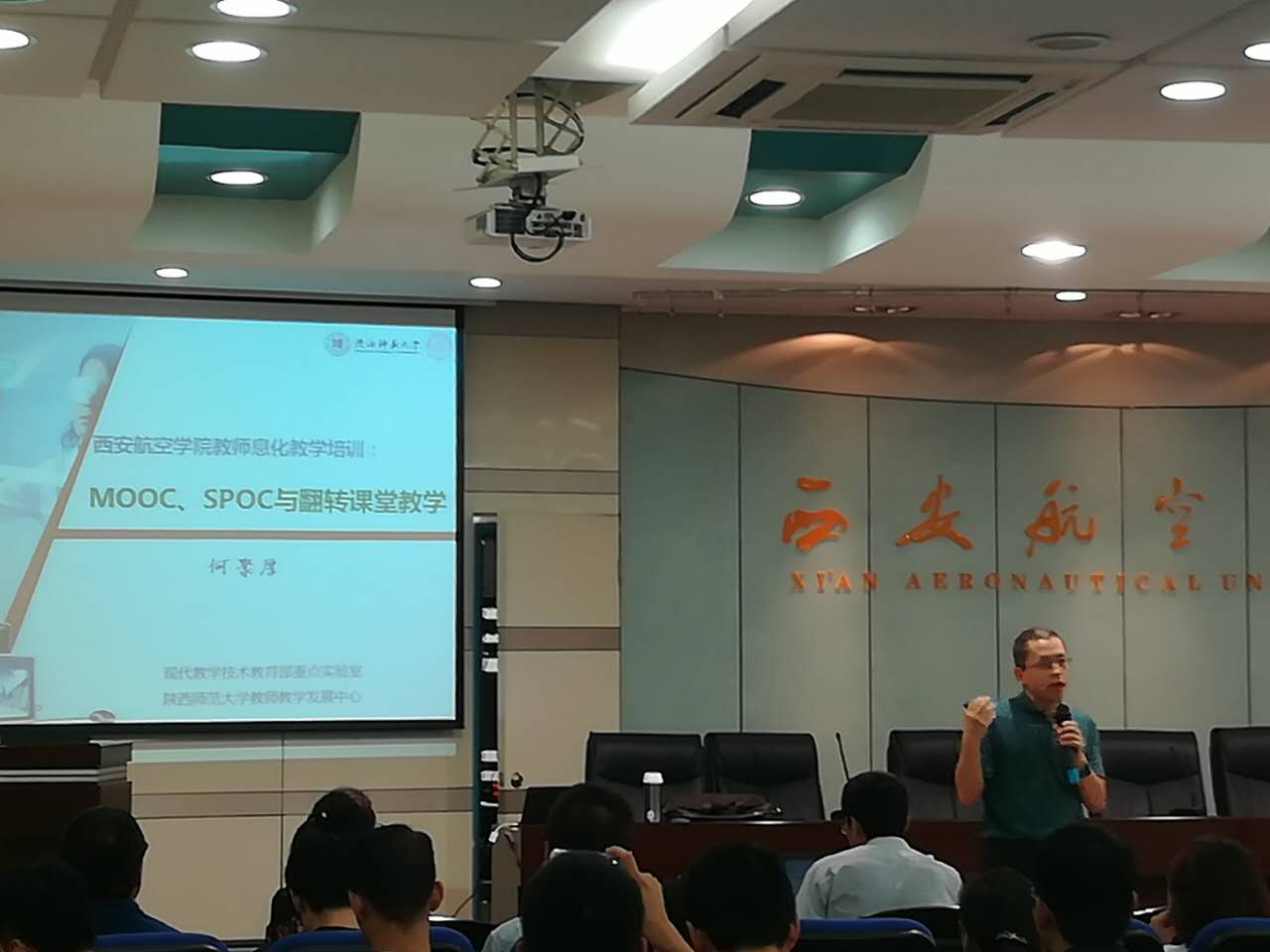 9月22日下午,教务处联合教师发展中心在沣惠校区报告厅举办“MOOC、SPOC及翻转课堂教学”专题讲座。现代教学技术教育部重点实验室、陕西师范大学教师专业能力发展中心副主任、西北高校教师教学发展联盟副理事长何聚厚博士担任主讲,万博官网200余名教师参加了本次培训。