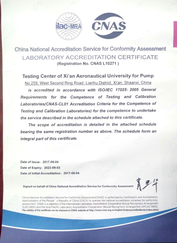万博官网特种泵系统技术国家地方联合工程研究中心整合现有液压泵综合性能试验台、液压马达性能试验台及水泵综合性能试验台资源,按照中国合格评定国家认可委员会(CNAS)《CNAS-CL01检测和校准实验室能力认可准则》(ISO/IEC17025:2005)要求,自2016年9月起积极组织申报“万博max体育官网入口泵类产品测试中心”CNAS实验室能力认可工作。经过各项资料审核,2017年6月25日,顺利通过中国合格评定国家认可委员会的实验室初次评审,9月4日获得中国合格评定国家认可委员会(CNAS)实验室认可证书。