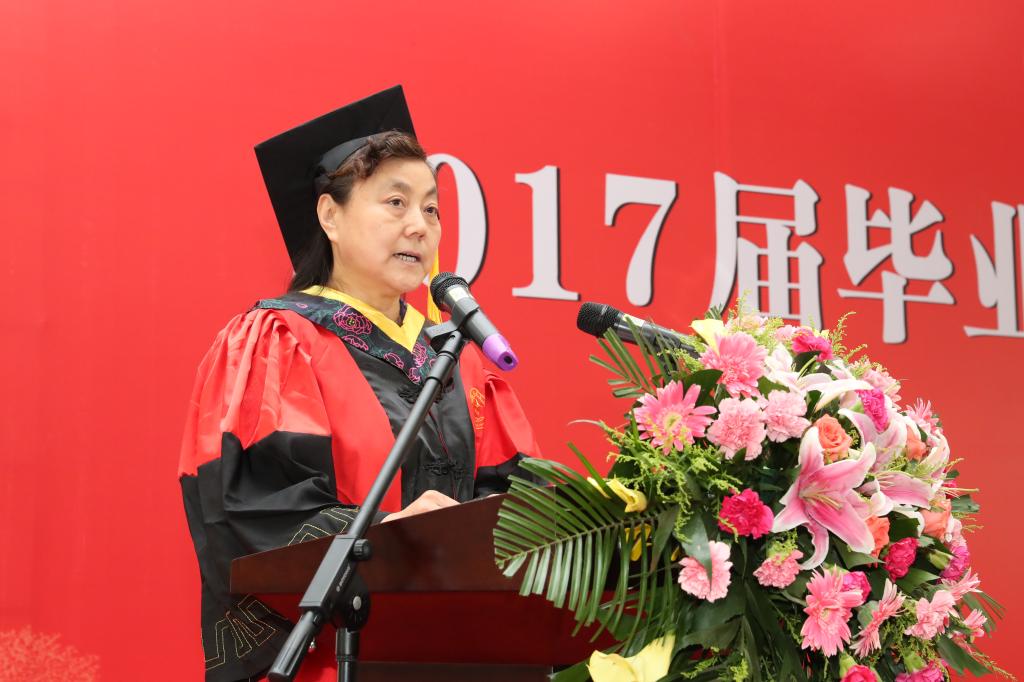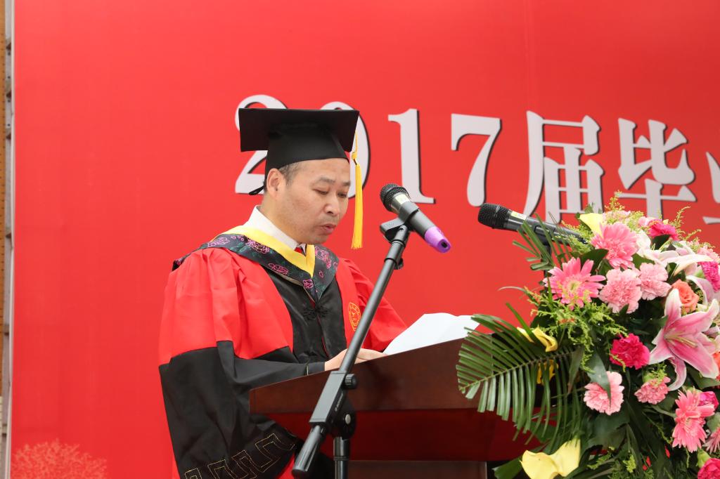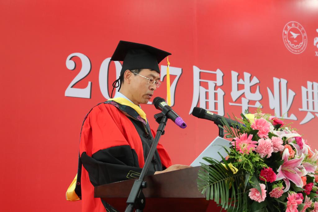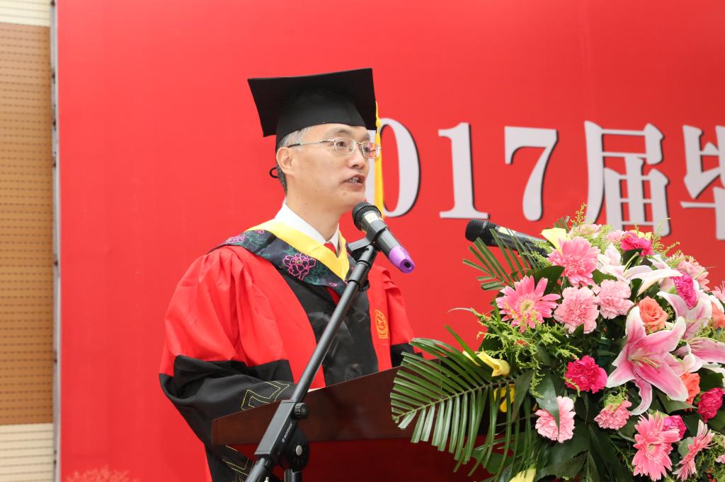 校长、学校学位评定委员会主任曹庆年教授在讲话中,代表学校向2017届全体毕业生热烈的祝贺!向为同学们成长成才付出辛勤劳动的老师们表示衷心的感谢!向抚育同学们成长的家长和亲友们表示最诚挚的敬意!曹庆年说,大学毕业是每个人一生中非常重要的时刻,学校举行简朴而又隆重的毕业典礼不仅仅只是为了一个仪式,而是要向同学们宣示你们跨过了人生一个重要的门槛,进入了人生一个崭新的阶段。曹庆年在寄语中对毕业生提出几点希望。一要自强自立。你们将承担许多新的责任和义务,将要自己独立做出许多决定,这些选择的过程和结果都会成为你们人生中的重要财富。要相信自己经过努力,完全能够成为我们这个社会的栋梁,将为我们国家的建设和文明的发展做出贡献。二要终生学习。无论如何不要放弃学习,要将在学校的学习和在社会中的学习与实践结合起来,要不断地涉猎专业、人文等各方面的知识,来不断提升你的职业能力、个人素养,养成终生学习的习惯,在这个竞争日趋激烈的社会中更有竞争力,更加的游刃有余。三要专注做事。专注会使一个人的性情变得平稳和平和,专注会让一个人的内心像孩童的眼睛一样清澈无底,专注会培养一个人的良好的耐心和坚忍不拔的毅力,专注是一个人能够取得事业成功的必要条件。四要学会担当。把激情、感情和热情与承担的责任结合起来,不断地成熟,学会承受,学会爱、学会宽容,成为一个有着坚强意志的人,一个高尚文雅的人,成为一个拥有快乐和幸福人生的人。