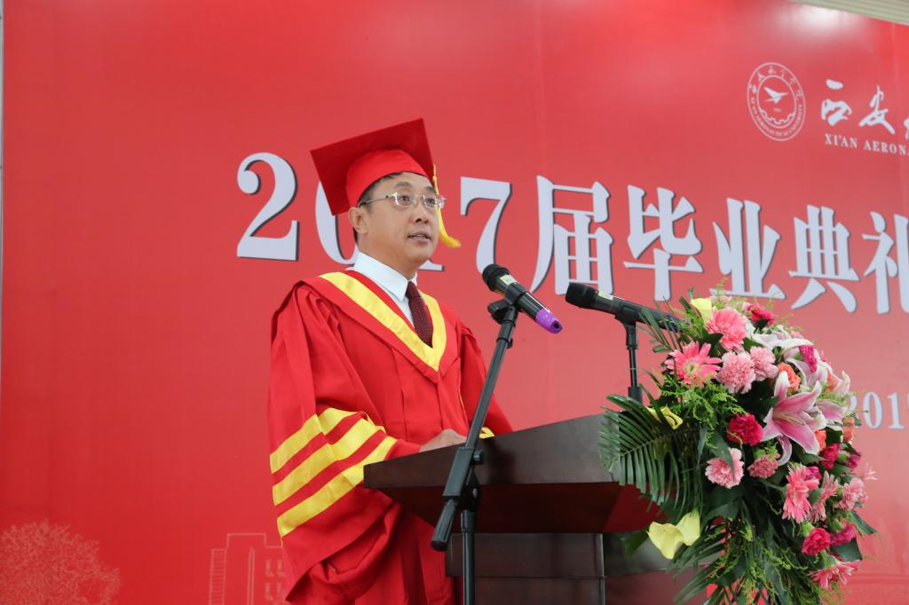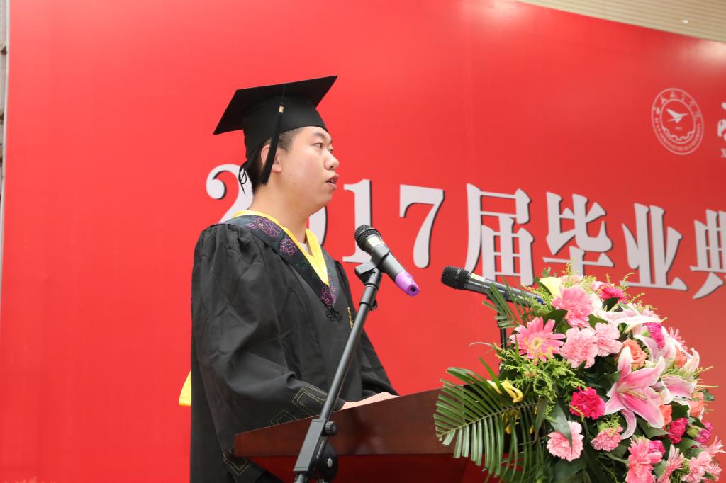 毕业生代表机械工程学院赵浩甲同学发言。他代表2017届毕业生表达了对母校和师长精心栽培、悉心指导的感激和感谢之情。表示将不辜负母校和师长的希望,传承航空精神,在远航的道路上坚守初心、砥砺前行,学有所用、回报母校、服务社会。