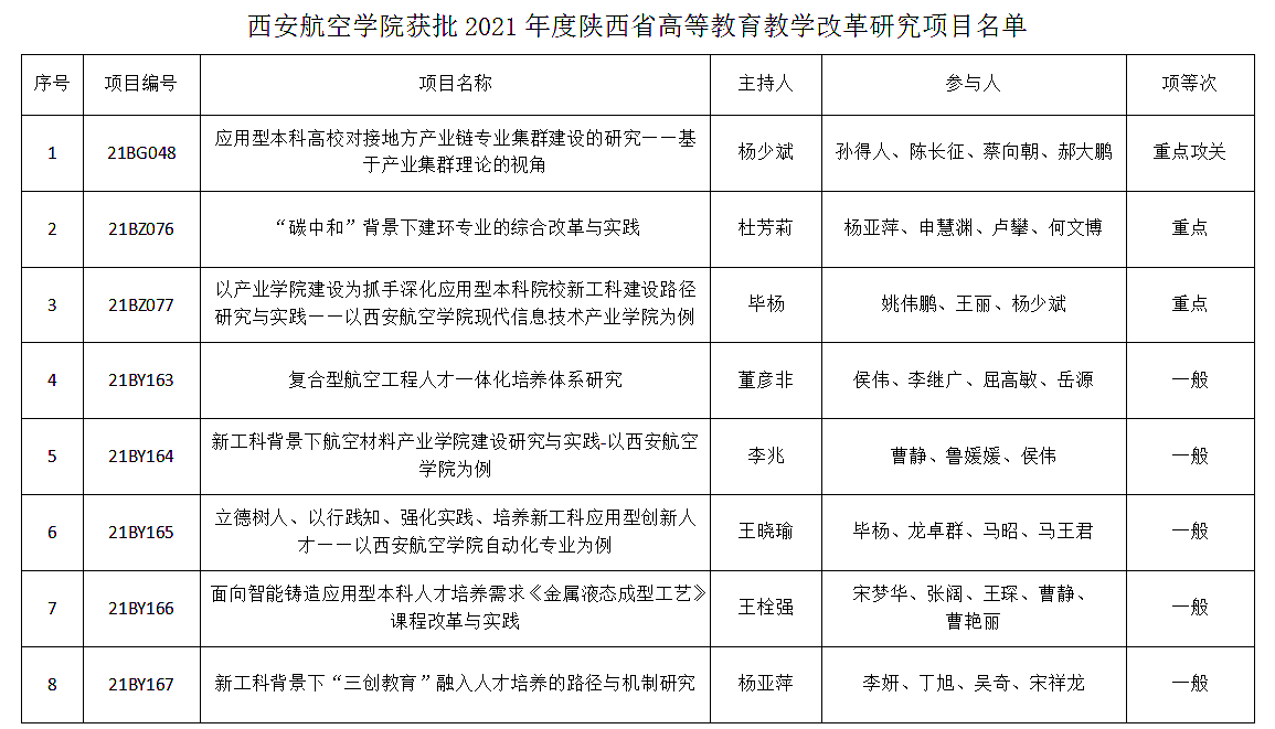 近日,陕西省教育厅发布《关于公布2021年度陕西本科和高等继续教育教学改革研究项目立项结果的通知》(陕教函〔2021〕1184号),2021年度共批准立项441个项目。万博官网8个项目获批,其中重点攻关项目1项,重点项目2项,一般项目5项。获批项目数量和质量均创历年新高。