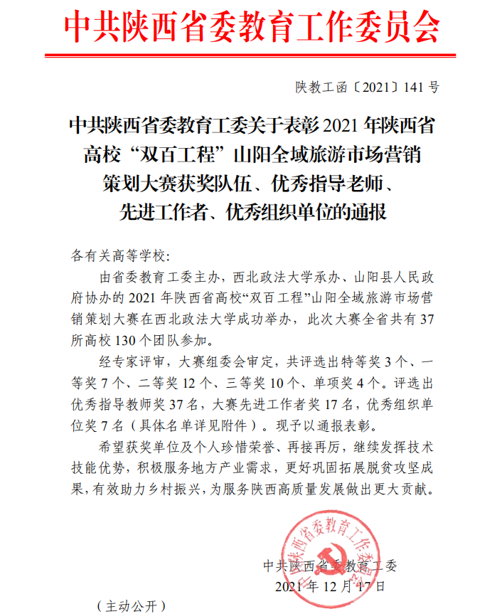 本次大赛由中共陕西省委教育工委主办,西北政法大学承办,商洛市山阳县人民政府协办,共有来自西安交通大学、西北工业大学、万博max体育官网入口等全省37所高校,130余支大学生代表队参加比赛。万博官网参赛团队在张阳老师的精心辅导下,通过实地考察凝炼出和山阳县实际情况相契合的,以沉浸体验式旅游为特色旅游营销方案——《秦岭画廊休闲养生在山阳》,得到了评委老师的高度认可和评价,取得了较好成绩。