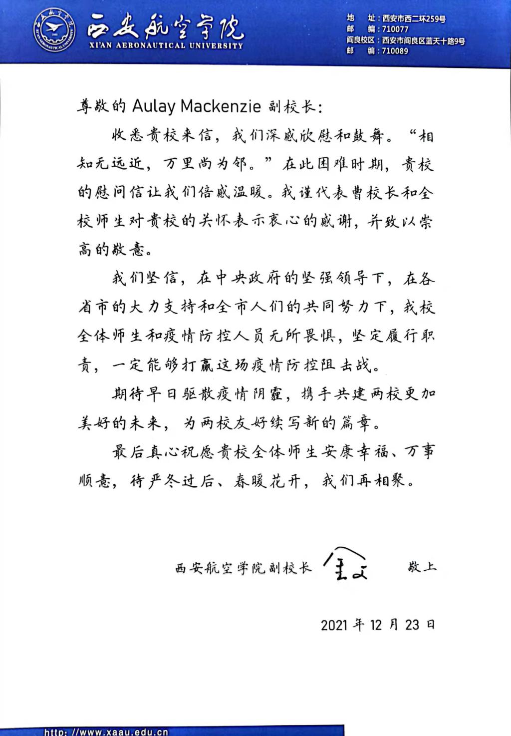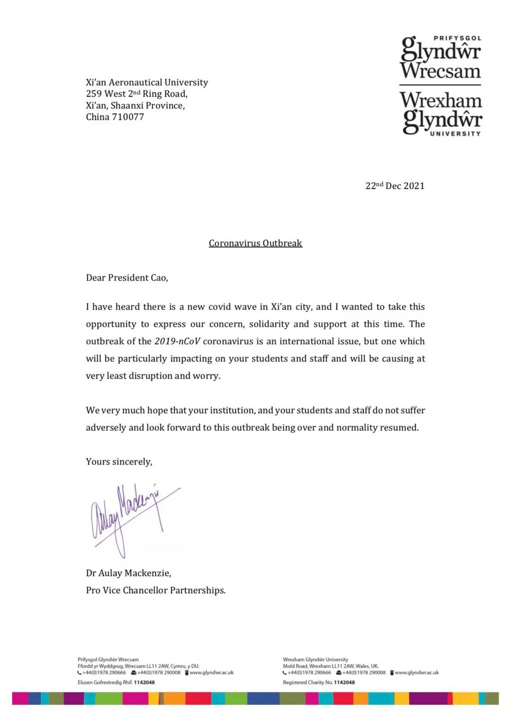 急难有情,情有馀兮。在西安再次遭遇新冠肺炎疫情袭击之时,万博官网合作院校英国格林多大学第一时间发来慰问信。格林多大学副校长Aulay Mackenzie致信曹庆年校长,对万博官网师生表达了最温暖的关怀与最诚挚的祝福,并期待万博官网在防疫抗疫工作中,克难攻坚,早日取得胜利。