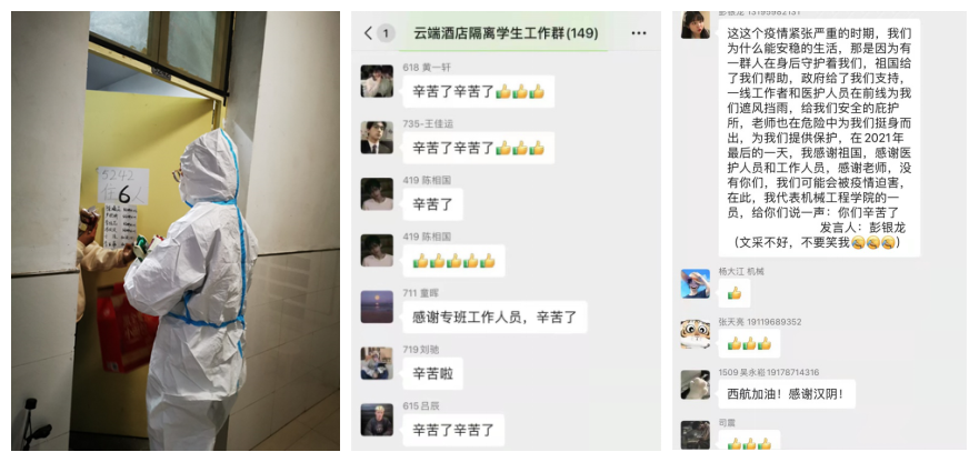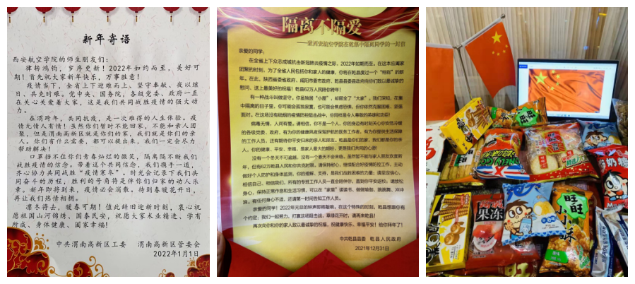 同时,在省市区县各级党委政府、学校的关心和派驻教师的陪伴下,当地政府、酒店专程为转运学生送来新年祝福、喜乐大礼和丰富餐食。同学和老师们纷纷通过各种媒体平台,以照片、短视频等多种形式表达心声:“感谢政府、感谢学校!”“感谢所有的大白!”“我们很好,请你们放心!”