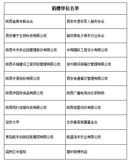 陕西省青年联合会、陕西米禾供应链管理股份有限公司、陕西开瑞建设工程项目管理有限公司、陕西伊园祥食品有限公司、陕西开源招标有限公司、陕西恒星纺织有限公司、陕西雨杉信息科技有限公司、陕西广播电视台乐家购物、中舜国际工程设计有限公司、西安康宁生物科技及有限公司、西安食通餐饮管理有限公司、西安市退役军人服务协会、中舜国际工程设计有限公司、延安大学、青岛凯丰创新控股集团有限公司、凯盛浩丰农业有限公司、郑州育贤斋餐饮管理有限公司、北京春苗慈善基金会、阎良区中医院、磨砂猴便利店等20家单位捐赠了N95口罩、防护服、防护面罩、医用酒精、84消毒液、电动喷雾器等11大类防疫物资,以及蔬菜、水果、牛奶、方便面、面包、矿泉水等8大类生活保障物资,牙膏牙刷、卫生纸等2大类日用物资。