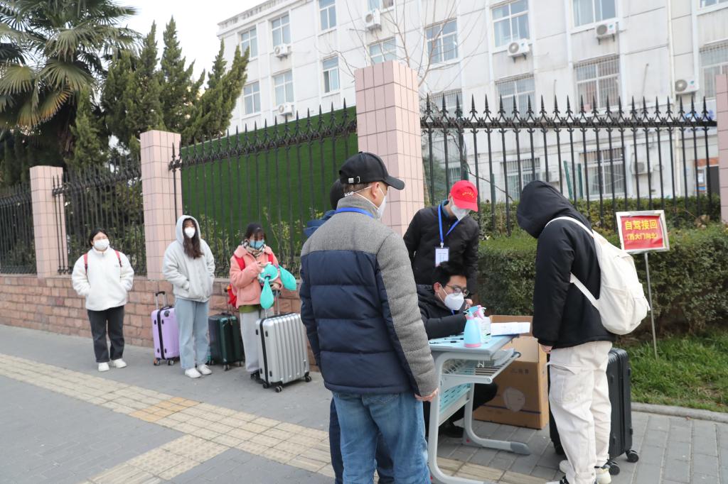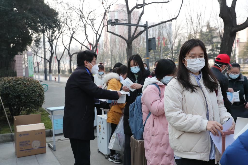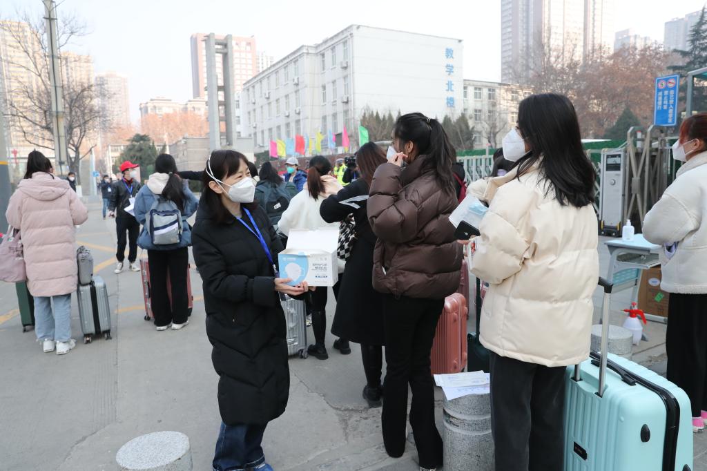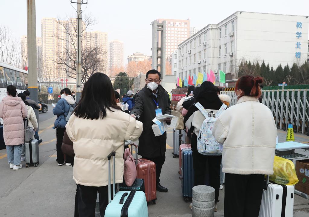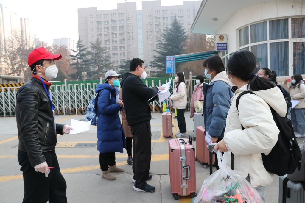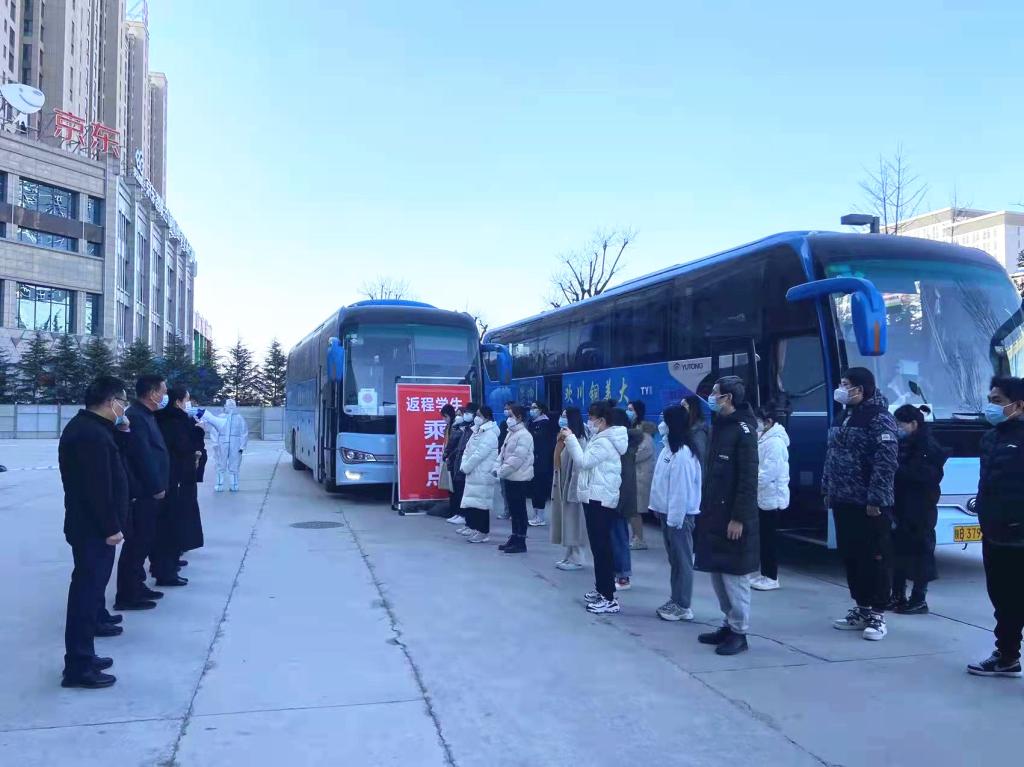 到校后,家庭居住地在低风险地区的学生由学校派车闭环转运至市区公共交通工具站点或由家长自驾车接回;家庭居住地在中高风险地区和寒假无法返家的学生返回学校。学校领导及相关工作人员到现场迎接返回师生,慰问大家,配发N95口罩,并叮嘱大家要严格按照疫情防控要求,做好个人防护,度过一个充实、安全的寒假。