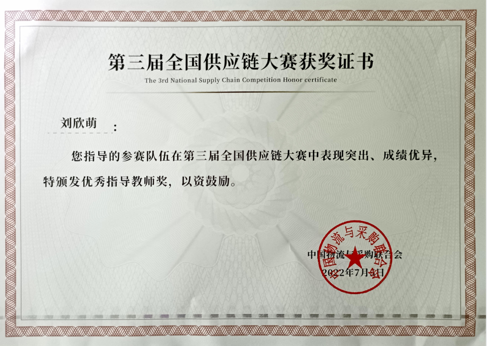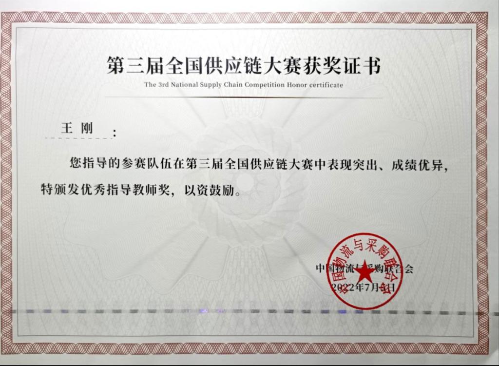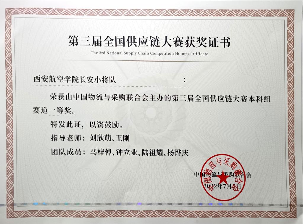近日,由中国物流与采购联合会主办的第三届全国供应链大赛结果揭晓。万博官网由经济管理学院刘欣萌、王刚老师指导的物流管理专业马梓倬,陆祖耀,杨烨庆,钟立业4名同学组成的“长安小将”队,经过激烈角逐,荣获本科组全国一等奖,这是万博官网首次荣获该赛项本科组一等奖。两位指导教师荣获优秀指导教师奖。