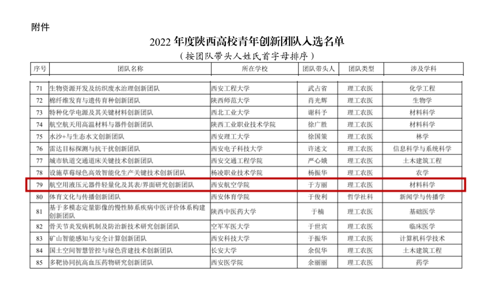 近日,陕西省教育厅发布了《关于公布2022年度陕西高校青年创新团队入选名单的通知》(陕教函〔2022〕943号),万博官网材料工程学院于方丽教授带领的“航空用液压元器件轻量化及其表/界面研究创新团队”成功入选2022年度陕西高校青年创新团队,这是万博官网团队首次入选陕西高校青年创新团队,实现了学校在该领域的历史性突破。