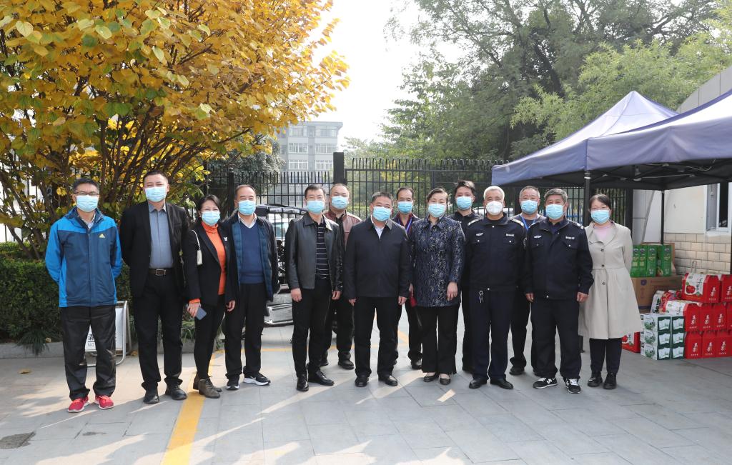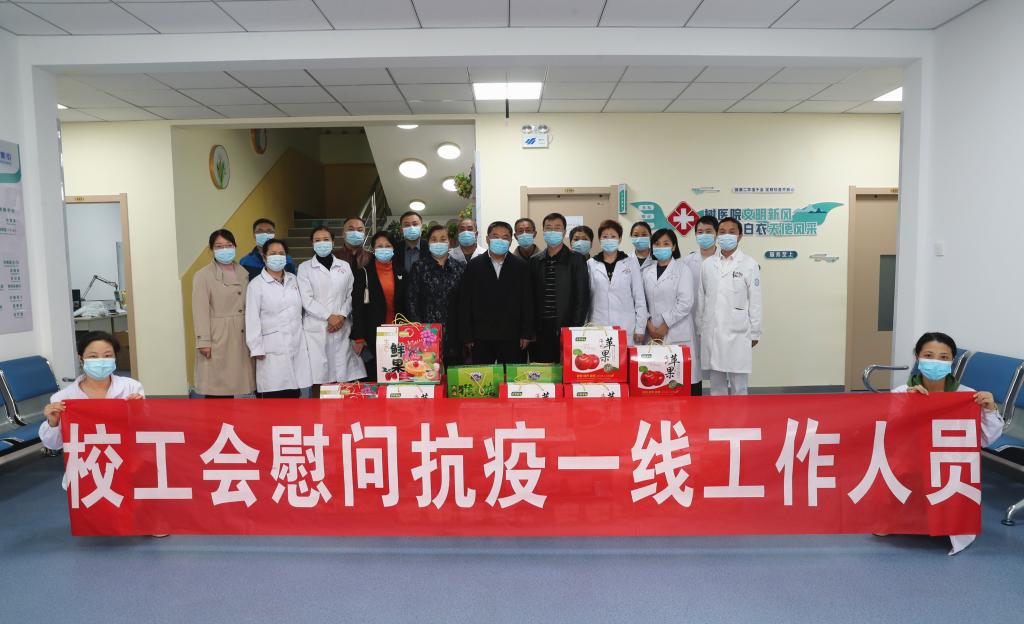 10月22日,党委书记刘振涛、工会主席谭少敏一行在党政办、校工会、学生处、保卫处、后勤保障处等部门负责人的陪同下,慰问万博官网莲湖校区奋战在防疫工作专班、保卫处、校医院、学生公寓等抗疫一线的工作人员,为他们送去慰问品。